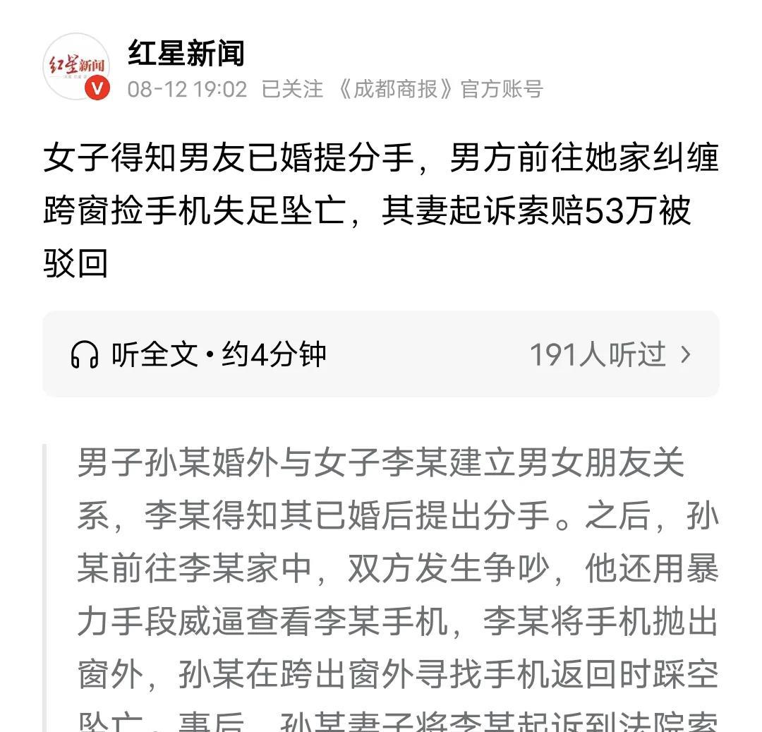吉林长春,女子发现男友有家室,怒提分手,不料,男友跑到女子家纠缠,拿菜刀非要要查看女子手机,女子把手机从5楼扔出窗外,男子爬到窗外缓台找手机,不慎踩空、坠亡,事后,男子妻子把女子告上法院,索赔53万,法院判决亮了! 8月12日红星新闻报道,孙某明明有媳妇张某,但是他却不安分守己,隐瞒自己已婚的事实,和女子李某谈起了恋爱。 然而,纸包不住火,李某还是知道了孙某是已婚人士了,她接受不了自己被 小 三,直接怒提分手。 正常来说,对于这种见不得光的感情,孙某本该撤退,可是,他不甘心放手,还想继续纠缠。 2024年5月14日这天,孙某拿着钥匙打开了李某家的门,因为李某主动提出分手,他心里有怨气,将屋里的东西砸了一通,一个人坐那借酒浇愁。 李某回家后,发现孙某在不禁火冒三丈,自己被他骗了本就无辜,想好聚好散,体面分手都不能够。 孙某不甘放手,纠缠不休,两人大吵起来…… 孙某不仅没有意识到自己的错误,还倒打一耙,坚持要查看李某的手机。 李某自然不同意,没想到,孙某情绪失控拿着菜刀非要李某交出手机,他说什么都要查看一番。 李某见曾经的恋人如此极端,也是气愤,都提出分手了,凭什么给他查看手机,一气之下她打开纱窗,把手机顺5楼扔了出去。 孙某一看手机被扔出去了,立马爬出窗外缓台上找寻手机。 看着这危险的一幕,李某十分担心,也跟着来到窗外,好说好商量的劝孙某回来。 孙某情绪缓和下来,让李某先进屋。他随后回屋的过程中,一个不小心踩空了,不慎坠楼。 李某见状吓得魂飞魄散,急忙跑下楼,找邻居借手机报警。 然而,不幸还是发生了,孙某最终没救过来。 警方到场,排除了刑事案件。 本以为这事就此结束,没想到,事后,孙某的妻子张某一纸诉状将李某告上法院,索赔53万余元。 李某万万没想到,还被孙某妻子告上法院让她赔偿53万,这搁谁能受得了。 有人说,男子强行闯入别人家闹事,别人为保护隐私扔东西,你非要爬窗捡,结果摔死了,能怪别人没拦住你吗?这不是自己找死吗? 法院查明,现场视频显示,案发现场五楼窗台狭窄,两个人不能搀扶并排走。 1、孙某妻子张某,需证明李某存在过错 比如,要证明李某故意或过失导致孙某坠亡,且过错与损害结果有因果关系。 《民法典》第1165条规定:行为人因过错侵害他人民事权益造成损害的,应当承担侵权责任。 法院认为: 第一,孙某的过错: 孙某作为已婚者,主动与李某建立婚外关系,本身违背道德,违反公序良俗。 孙某主动纠缠李某,持钥匙闯入李某家中破坏财物、饮酒,并持菜刀非要查看手机,行为具有明显过错; 第二,李某抛手机是为保护隐私,孙某跨窗找手机属自主危险行为,是他自己做出的决定,超出李某可控范围; 第三,李某随后劝孙某回来,李某见孙某坠楼后,借邻居手机报警、呼叫急救,已经尽到救助义务,无过错。 2、李某和已婚的孙某存在婚外关系,李某要为孙某的死亡承担责任吗? 《民法典》第8条规定:民事主体从事民事活动,不得违反法律,不得违背公序良俗。 李某与已婚者恋爱虽违背道德,但法律仅在行为直接导致损害时追究责任。 孙某作为完全民事行为能力人,主动跨窗找手机并踩空坠亡,属“自甘风险”。 李某未诱导或强迫孙某去捡手机,无需担责。 一审法院判决:驳回孙某妻子张某的请求。 张某不服,提出上诉。 二审法院明确,李某的行为虽不道德,但与孙某死亡无法律上的因果关系。因此,驳回上诉,维持原判。 3、爱一个人,不该是占有和控制;爱一个家,更不该是背叛和伤害。 孙某的悲剧,根源在于他对“爱”的扭曲理解。 孙某明知自己已婚,还和李某恋爱,是对婚姻的背叛。 李某发现他已婚后提分手,孙某用暴力、侵入等极端手段纠缠,是对他人边界的践踏。而跨窗捡手机这种危险行为,是对自己生命的漠视。 他的死,不是“为爱牺牲”,而是为自己的越界和冲动付出了代价。 可悲的是,他的妻子把矛头指向了李某,却忽略了一个更残酷的真相:真正毁掉这个家的,是孙某自己对婚姻的不忠、对法律的漠视。 关注@福康说法 从日常点滴学法律,生活安稳更有底