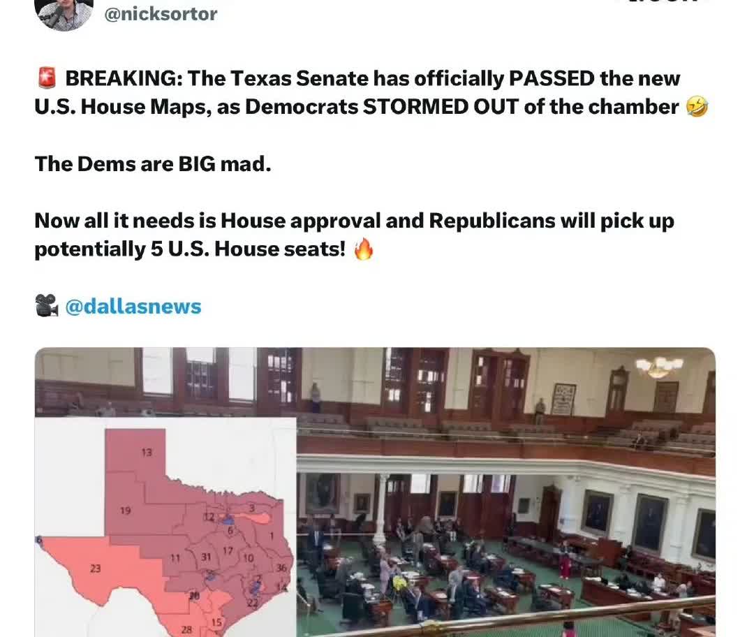 美德州参议院正式通过了新的联邦众议院选区划分方案,民主党人愤然离席。 现在只需要德州州议会批准该选区划分方案,共和党就能增加5个联邦众议院席次!