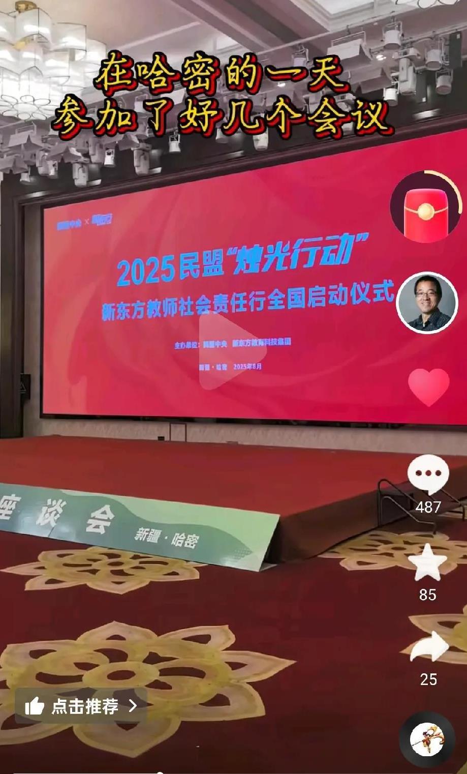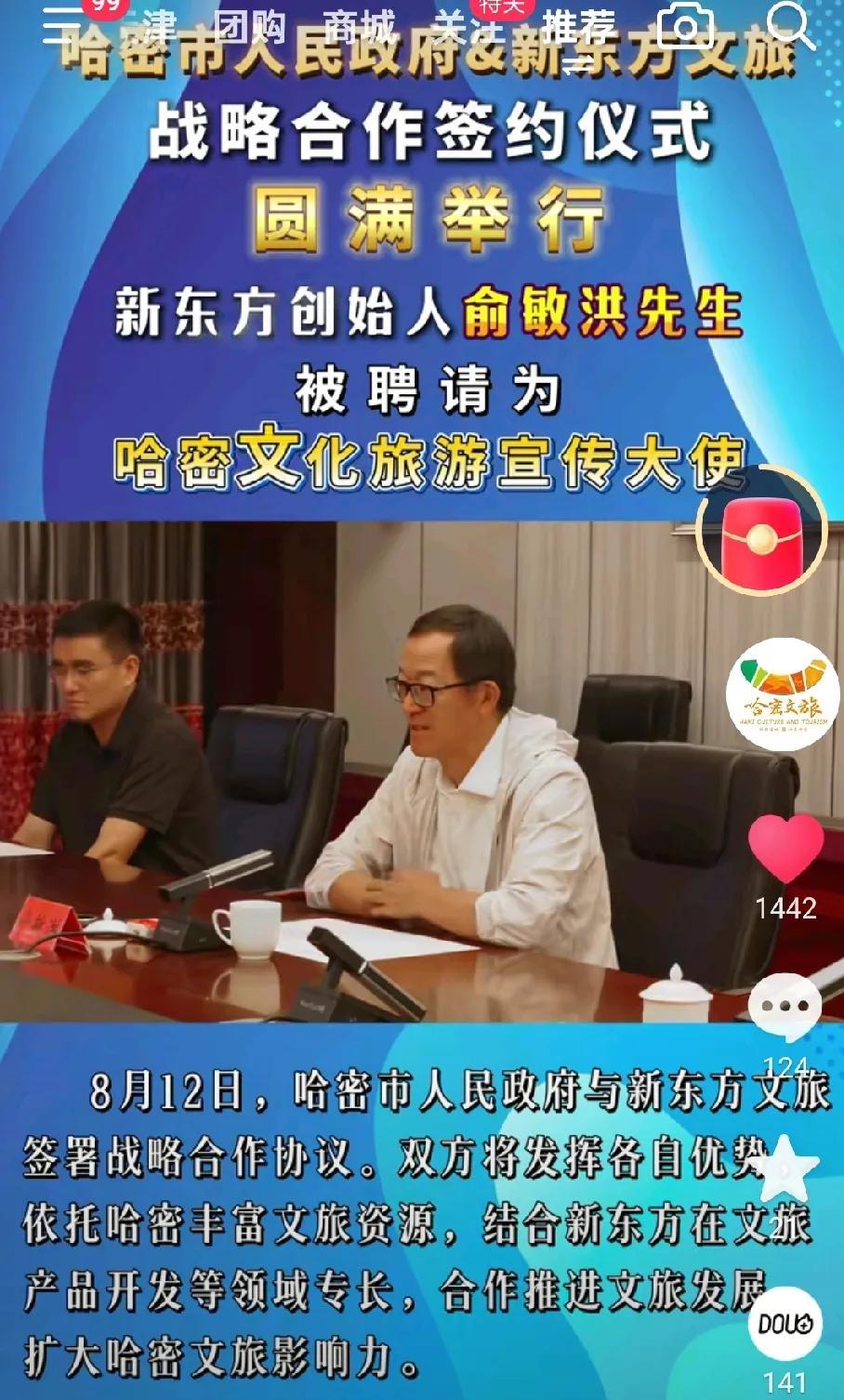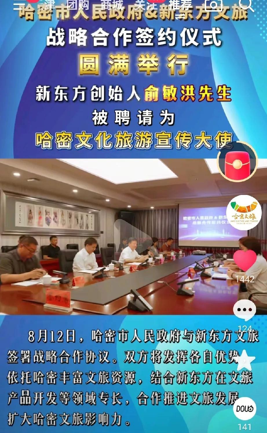 俞老师结束了十八天的长途跋涉后,不是休息,而是投入到更有意义更有价值的工作中,在哈密的一天,先后参加了"2025民盟烛光行动新东方教师社会责任行全国启动仪式″大会和首届土壤生态座谈会,并和哈密人民政府举行了与新东方文旅的签约仪式,并授予″哈密市文化宣传大使″的称号。 俞老师在文旅事业中一直在身体力行,每到一个地方都是在极力宣传当地独特风光,跟着俞老师让我们看到了太多的美好,祖国的山川河海、地方美食、人文地理、传统文化等等, 文化旅游大使,俞老师名副其实! 期待在新东方的带领下,越来越多地方的文旅步入正轨,逐步与新东方建立战略合作关系。