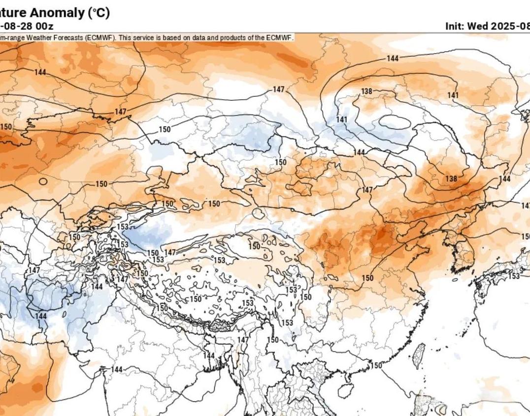 根据最新的15天数值预报,8月28日副热带高压依然强势,南至广东、广西,北至河北