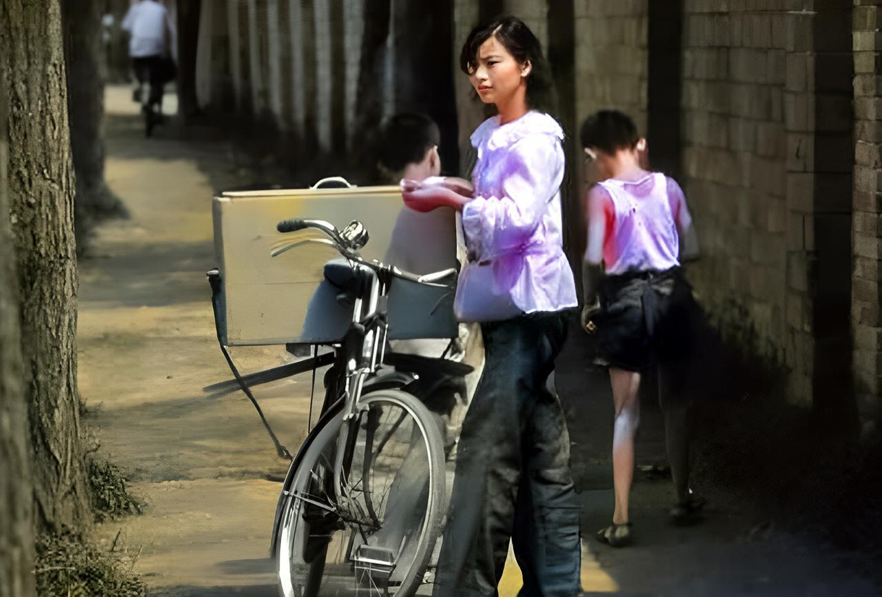 这是1982年北京胡同里的冰棒西施。这名冰棒西施不仅颜值很高,装扮也非常时髦。她骑着一辆自行车。自行车的后座上放着一个大木箱。木箱里面装着夏天孩子们喜欢的冰棍。冰棒西施骑着自行车载着冰棍走胡同串巷卖冰棍。 当发现孩子们聚集玩耍的地方,她会故意将自行车停在孩子们的旁边。炎热的夏天,孩子们极少能抵挡住冰棍的诱惑。他们或凑钱买冰棍,或有钱的买冰棍分着吃。当然,当孩子们买的冰棍很多。冰棒西施也会多送他们一根。因为,她知道这些孩子才是她最真诚的顾客。 当年,许多人就是靠骑着自行车走街串巷卖小食品发家致富的。他们从小商小贩起家,凭着自己的勤奋与聪明做出了一番事业。这名冰棒西施也是非常吃苦。当许多姑娘在炎热的夏天睡午觉时,她却骑着自行车卖冰棍。
