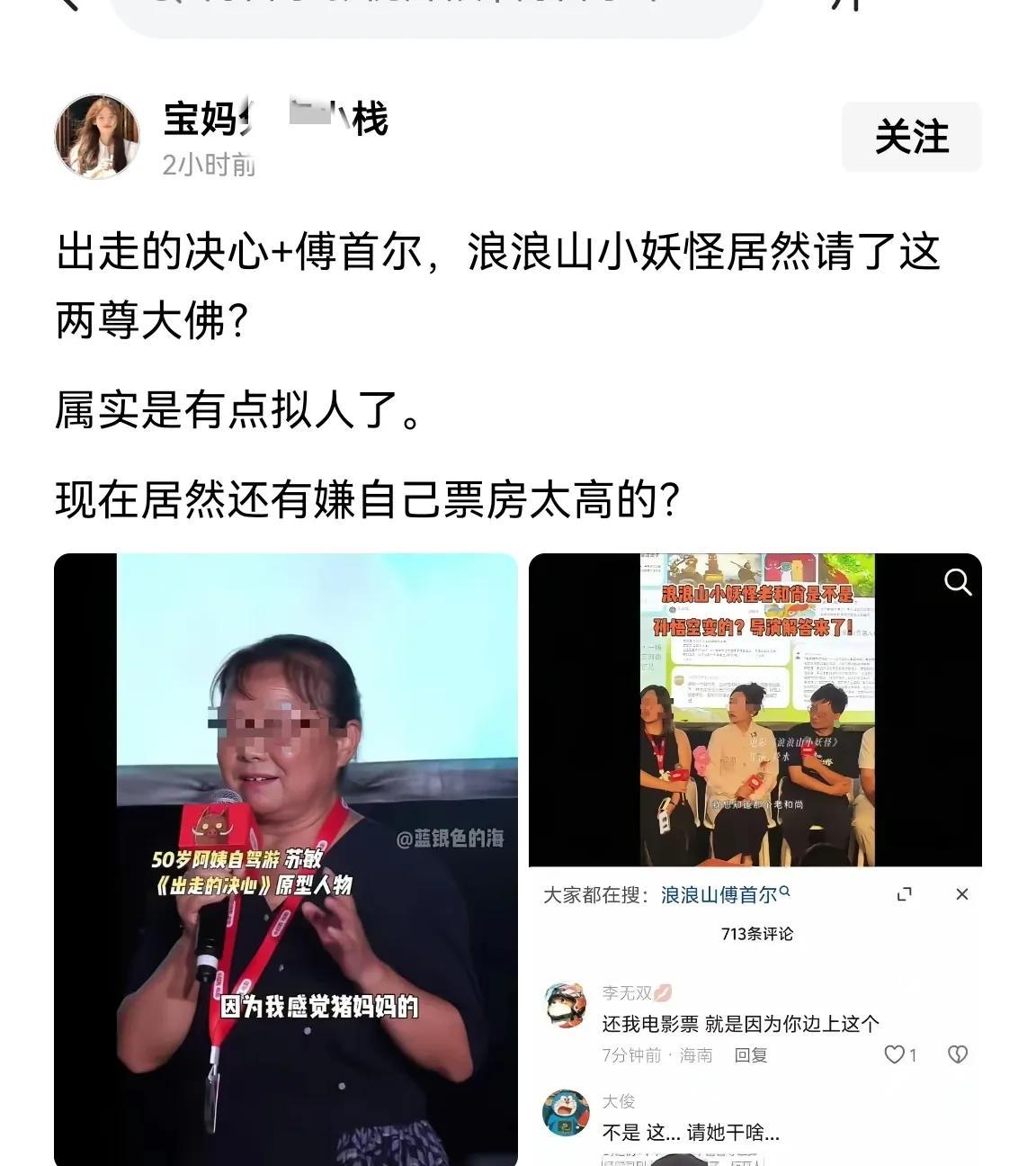 《浪浪山小妖怪》这不是自毁前程? 请傅首尔和苏敏站台?我真的不理解,打女拳的也请? 本来挺火,上映十天拿了5.74亿,还是国产二维动画票房第一,央视都夸它国漫新里程碑。 讲小猪妖逆袭,有亲情羁绊,挺暖的。 可宣发团队犯了糊涂,傅首尔离婚后总说独立女性,苏敏靠逃离家庭主妇走红。 俩人在活动里大聊家庭束缚,女性要独立,跟电影里的温情团圆完全对不上。 一边说家人好,一边让女的逃家,逻辑呢? 前期说合家欢,现在请女权代表,自相矛盾! 豆瓣一堆一星差评,# 浪浪山避雷 #话题千万阅读量。 推荐了那么久,就这?导演出来解释老和尚代表成长,没用。 好好的动画,被营销拖进了性别吵架的坑。 你觉得,电影宣传硬贴话题,是不是自毁前程?