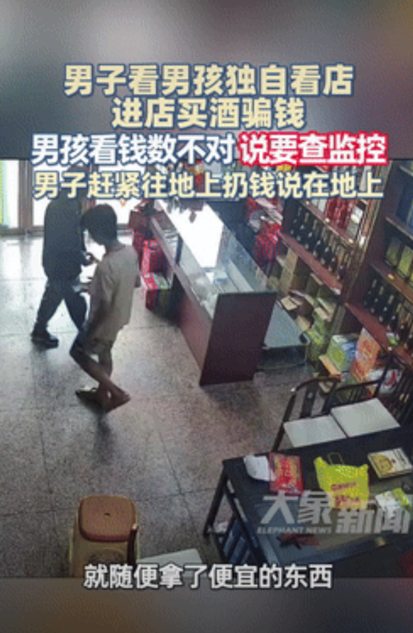 心可真大!广东陆丰,一女子让小外甥帮忙看店,不料,有个路过的男子看到后,竟走进店里准备买酒骗钱,幸好被外甥用机智给成功化解,网友:现在的小孩真是比大人都聪明多了! 据大象新闻8月12日的报道,女子因有事需要外出一趟,所以就让自己的小外甥,帮忙看一下门店,想着也不会出现什么意外情况。 然而,令谁都没想到,有个男子从门口路过时,无意间往店里瞟了眼,在见到只有个小孩在时,心里瞬间就生起邪念。 随后他就停下脚步,转而走进店里买东西,他先是拿了点便宜的东西,接着就从兜里掏出一张百元大钞,让男孩找零钱。 可当他转身去找零时,男子又表示自己身上带有零的,让把百元大钞还给他,男孩闻言就照做了。 不过,在拿到钱之后,他就将其藏到手里的零钱下面,并让男孩接着找零,直到男孩将钱都放在柜台上后,他就想要把零钱拿走。 但他明显低估了男孩的聪慧程度,在见到他伸手拿钱时,男孩就问那1百块呢,男子便说道已经给过了。 心中有些不确定的男孩,就去查看店里的监控,眼看事情马上就要败露,男子急忙将藏好的1百元给扔到地上,表示钱在地上,接着连东西都不要了,急忙离开了店里。 所以说,非必要最好不要留孩子独自看店,以免被某些不怀好意的人盯上,最后也为男孩的机智点个赞。