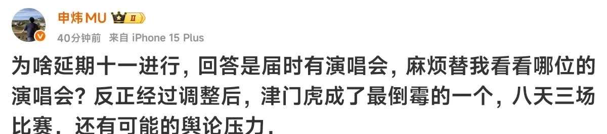 中国足球在国内的地位有多低,从浙江与天津津门虎的中超联赛改期就可以看出来。 中足联正式发通知8月月30日浙江与天津津门虎的中超联赛因为U23国家队集训提前到8月20日,届时津门虎要在8天踢3场比赛,津门虎当然不同意想延期到10月份,但浙江方面以10月份杭州黄龙体育场有演唱会拒绝了,不得已天津津门虎只能同意改期到8月23日。 津媒申炜在自己的自媒体平台报道了这条消息! 看到这条消息的球迷不禁发出感叹,中国足球顶级联赛都不如歌星演唱会地位高,这就是中国足球现状。 试想欧洲会有足球联赛为演唱会让路的吗? 当然也有球迷认为津门虎太软弱了,这方面津门虎也没办法,毕竟目前的中超联赛由中足联管理。