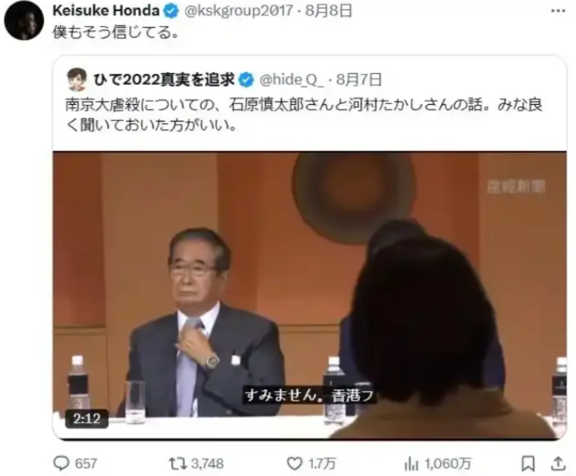 日本人知错能改?8月8日,日本前国脚本田圭佑声称:“南京大屠杀是不存在的。”谁料,一天后自己“打脸”诚恳道歉:“我错了!自以为懂历史。”同时晒出大段文献科普日军罪行。 《南京照相馆》这电影的爆火,让南京大屠杀在日本那边又成了热议话题。 网上不少人还在硬说“南京大屠杀根本没这回事”,但有个名字突然被大家揪出来讨论——日本前国脚本田圭佑。 本田圭佑在日本足球圈名气不小,以前穿着国家队球衣在赛场上跑的时候,多少球迷为他喊过加油。 可这次他掺和历史话题,一下就把自己推到了风口浪尖。 8月8号那天,他在“X”上转了个视频,是日本右翼头面人物石原慎太郎生前的讲话。 视频里石原唾沫横飞地说,“南京大屠杀没证据”,还说“那时候日军的时间和武器,根本不可能搞大屠杀”。 本田圭佑自己还加了句“我也觉得是这样”,这下可捅了马蜂窝。 他那些老球迷一看就急了,评论区里立马炸了锅,有跟着石原瞎起哄的,说“就是没这事儿,别被洗脑了”;更多人是真失望,有人直接说“粉了你这么多年,没想到你是这认知”。 还有人更直接:“历史又不是信耶稣,哪能说信就信、不信就不算数?不会自己去查资料啊?” 谁也没料到,本田圭佑还真听进去了,第二天,他又在“X”上发了一长串东西,全是跟南京大屠杀有关的材料。 点开一看,好家伙,有中国这边官方存档的记录,有当年“南京安全区国际委员会”留下的档案,还有当时美国《纽约时报》、英国《泰晤士报》的报道,甚至连日军自己写的战地日记、部队报告都有。 他特意在后面补了句,这些东西都不是打完仗才编的,是好几个国家的人在同一时间记下来的。 最后他说的那番话,倒是挺实在:“我一直挺佩服石原慎太郎,以前总觉得自己懂点历史,就凭着感觉瞎评论。 这回真坐下来看了这些一手材料才明白,南京大屠杀是真真切切发生过的,之前是我错了。谢谢大家骂醒我,给我机会重新学历史。” 就这几句话,评论区直接爆了,一下子涌进来1700多条评论,要知道他平时发条训练动态,评论能过百就不错了。 日本网友里头,不少人酸溜溜地说“一天时间就叫研究?怕不是看了几篇网文吧”,还有人更损,说“踢球的懂什么历史,怕是连字都认不全”。 日本新闻网站报道这事儿,下面的评论更是一边倒的骂声,说他“丢日本人的脸”。 但直到现在,本田圭佑那条认错的动态还在那儿挂着,没删,也没回嘴辩解。 了解他的人都知道,这哥们儿向来如此,爱说大实话,以前就因为敢说得罪过不少人。 讨厌他的人骂他“嘴上没把门的”,喜欢他的人倒觉得他“敢说别人不敢说的,够爷们儿”。 而咱们中国网友,几乎是一边倒地为他点赞,说“敢认错就比那些装聋作哑的强”。 其实作为公众人物,本田圭佑这事儿做得确实跟其他日本名人不太一样。 在日本那边,一提南京大屠杀,多少政客、明星不是装没听见,就是打太极说“历史问题很复杂”。 可他先是犯了错,然后真敢站出来认错,这就挺难得。 公众人物的一句话,影响力可比普通人大多了。他一句“我也相信”,保不齐就有多少不了解历史的年轻人跟着信了邪。 但他后来能改过来,其实也是在给其他名人提个醒:说话不能只凭自己的好恶,得看看事实到底是啥样。 他贴出来的那些史料,才是真能打那些“历史虚无主义”嘴巴子的东西。 右翼不是总喊“没证据”吗?你看看,中国官方的档案里记着当时的死难者数字、埋尸记录;国际安全区的外国人日记里写着亲眼看见的烧杀抢掠; 外国记者发回的报道里附带着现场照片;就连日军自己的战地报告里,都有“扫荡完毕,处理××人”的字眼。 这么多来自不同国家、不同立场的人,在同一时间记下了同一件事,这还能有假? 南京大屠杀是全世界都认的事实,谁也别想改。本田圭佑这前后一变,其实就是在给这话做注脚。 不管有些人怎么梗着脖子不认,那些档案、照片、日记就摆在那儿,只要有人愿意伸手翻一翻,真相就藏不住。 历史这东西挺有意思,有时候会被人用各种法子盖起来、藏起来,但只要有像本田圭佑这样愿意较真的人,一点点去扒,总能见着太阳。 一个人醒过来可能没啥,但醒过来的人多了,那些瞎话自然就没人信了。 历史的真相或许会被乌云挡一阵子,但绝不会永远见不着光。一个人的觉悟可能轻如鸿毛,可当越来越多的人敢直面过去,谎言就只能躲在角落里发抖。 【评论区聊聊】你怎么看待本田圭佑这这件事?