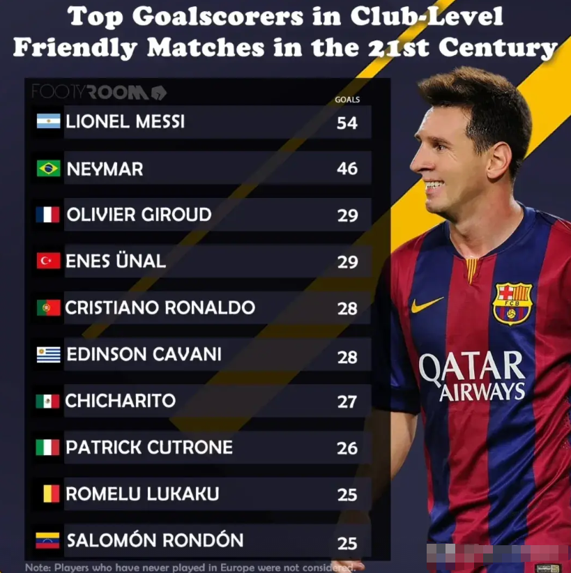 【没想到国家队和俱乐部层面排名第一的都是梅西】 因为国家队友谊赛的进球会被统计到球员的正式进球里,所以大家此前都知道梅西是21世纪国家队友谊赛进球最多的球员,他的国家队112个进球里有49个是友谊赛进球! 相比较国家队俱乐部友谊赛的进球不被统计到球员的正式进球里,所以此前大家不太清楚球员们俱乐部友谊赛进球数。根据最新统计21世纪俱乐部友谊赛进球数梅西同样排名第一,为54球! 内马尔以46球排名第二,而最近三场友谊赛打进6球的C罗以28球排名第五!