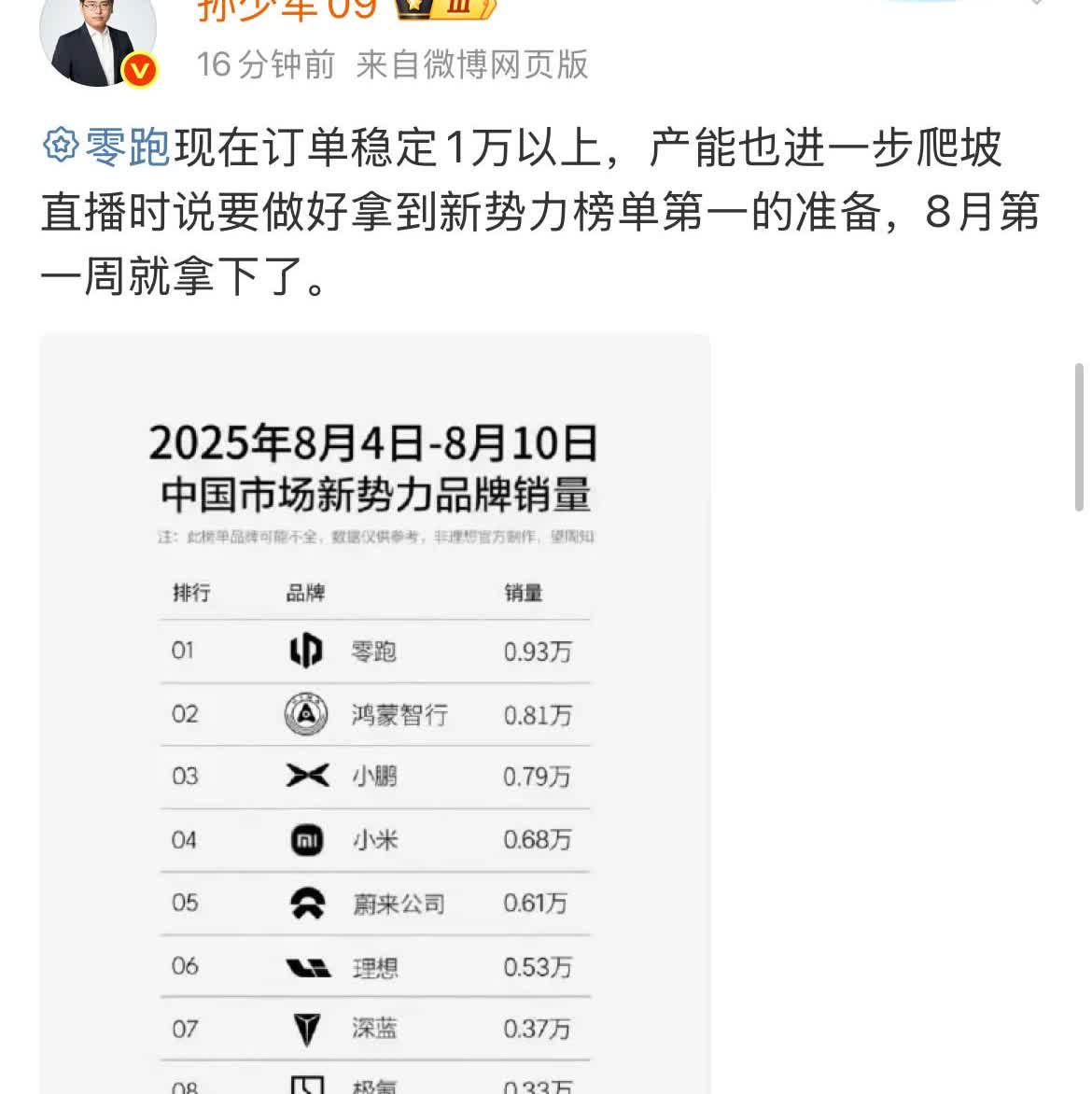 孙少军: 零跑现在订单稳定1万以上! 就在刚才,孙少军发出了上一周的销量榜单,现在的情况都不是第一第二的问题,而是零跑他们要持续稳定多久的问题! 而且他们内部也已经达成了共识,那就是要持续的稳定的发力,说通俗一点就是要把目前的这个销量趋势保持下去,把目前的这个榜单位置也稳稳当当的保下去! 当然,他们不仅仅是在国内,要把主流的销量做好,同时在国外也要学习比亚迪海外市场稳定的扩展下去,也就是说要双管齐下,这个双稳定的策略,是他们敢这样说的底气。