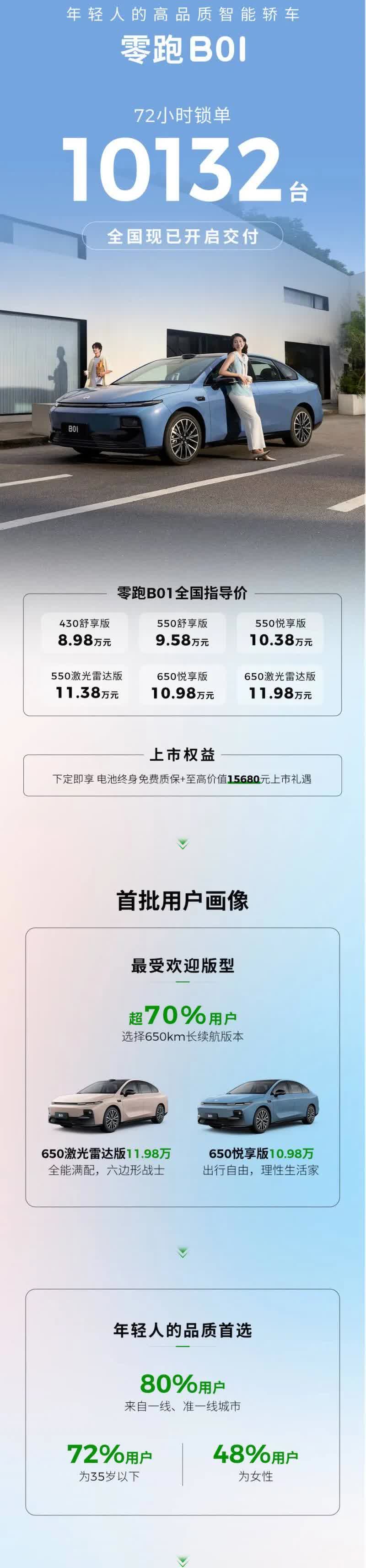 零跑蝉联周销冠,B01刷新双纪录。 随着今天中午,新势力第32周销量的放榜,我们注意到,零跑汽车再次蝉联新势力销冠,交付量达0.93万辆。排名第二的,是鸿蒙智行,交付了0.81万辆,第三是小鹏,交付了0.79万辆。我们可以注意到,最近这两周小鹏也是追上来了,榜单前三基本都有它。 要说今年的零跑,不论是焕新改款,还是全新车型,都可以说是上一台,热销一台。就说不久前才正式开售的B01,它只用了72小时,就实现了10132台的大定锁单,新增订单也是节节攀升。而对此早有准备的零跑,加大产能投入,仅用一周就实现了10000台下线,而这两项数据其实都已经刷新了零跑品牌的最快纪录了。 从产品层面来看,其实不管是焕新即畅销的C系列,还是B系列,零跑对待所有产品都是一视同仁,B01 10万级就有650km续航+19分钟快充、11万级有8295智舱,还有8650+激光雷达端到端辅助驾驶,你别说13、4万的小鹏M03了,就是23万+的Model 3,它在智能上都有得一拼。 就这表现,品牌累计百万台还不是迟早的事儿?