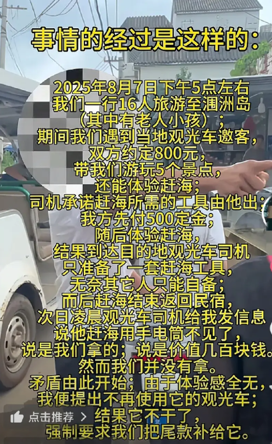 这样的涠洲岛,谁敢去?一女子发视频称,她们一行16人旅游至涠洲岛,遇到当地观光车邀客,双方约定800元,带她们游玩5个景点,还能体验赶海。