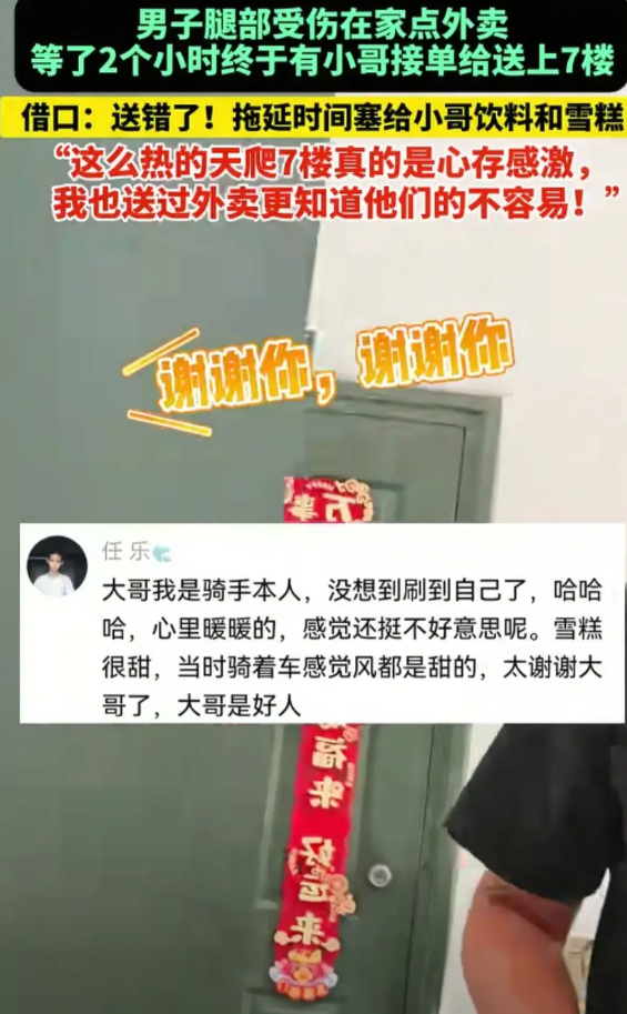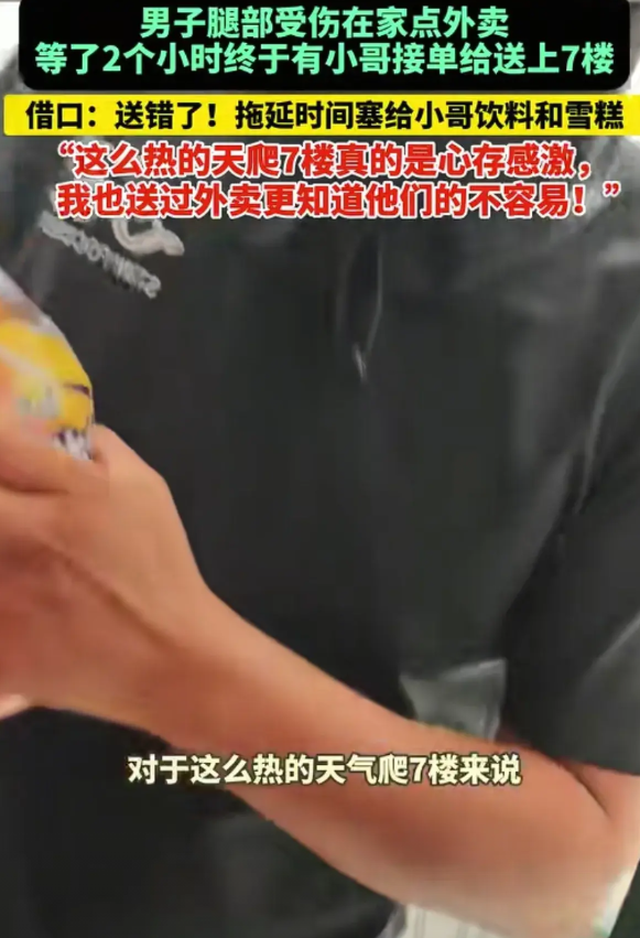 山东,男子家住7楼,因为腿受伤在家点了外卖。小哥送餐过来后,男子忍不住问:“我这订单两个小时没人接,你怎么就接了啊?”