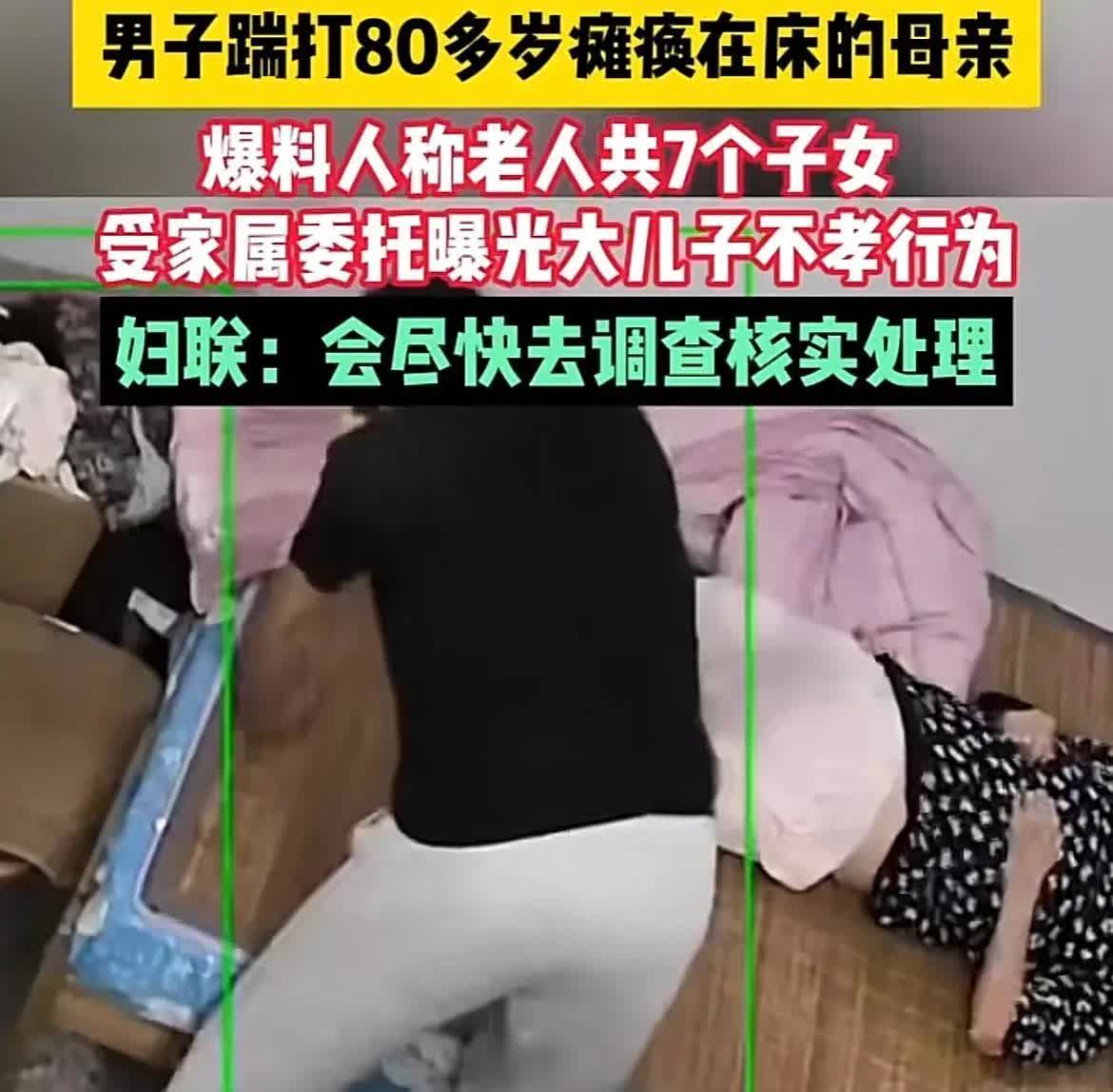 “太不是东西了!”广东河源,一男子踹打80多岁,瘫痪在床的老母亲。网友:打父母的人猪狗都不如,还有什么脸活在社会! 广东河源有个事儿让人特别生气,一段儿子打自己瘫痪老妈的视频在网上传得到处都是。视频里,一个八十多岁的老太太,身体特别虚弱,躺在床上被自己的亲儿子又打又踢,根本没法反抗。 老太太穿着黑花上衣和粉色睡裤,瘦得皮包骨,只能躺在床上。她的大儿子呢,穿着黑T恤和白裤子,下手特别狠,不停地用拳头砸老太太的腿,甚至还跳起来用脚猛踹。老太太被打后,只能自己默默揉着疼的地方,连话都不敢说。这段视频肯定是家里人偷偷拍的,实在是看不下去了,才发到网上求大家帮忙。老太太瘫痪好多年了,一直需要人照顾,结果却遭到亲生儿子的毒打。作为家里的老大,他本该好好孝顺老人,结果却成了最心狠的那个。网友们看了都气炸了,纷纷留言说:“打父母的人连猪狗都不如,还有脸活在这世上吗!” 这事儿不只是道德败坏那么简单,还触碰了法律的红线。按照《民法典》和《刑法》的规定,成年子女得赡养父母,虐待家人,特别是打老人,那可是犯法的,得追究法律责任。听说当地的妇联已经介入调查了。现在,那个男的已经被盯上了,事情正在查。我们希望法律能给老人家一个说法,同时也提醒大家,孝顺老人不能忘,做人的底线不能破。