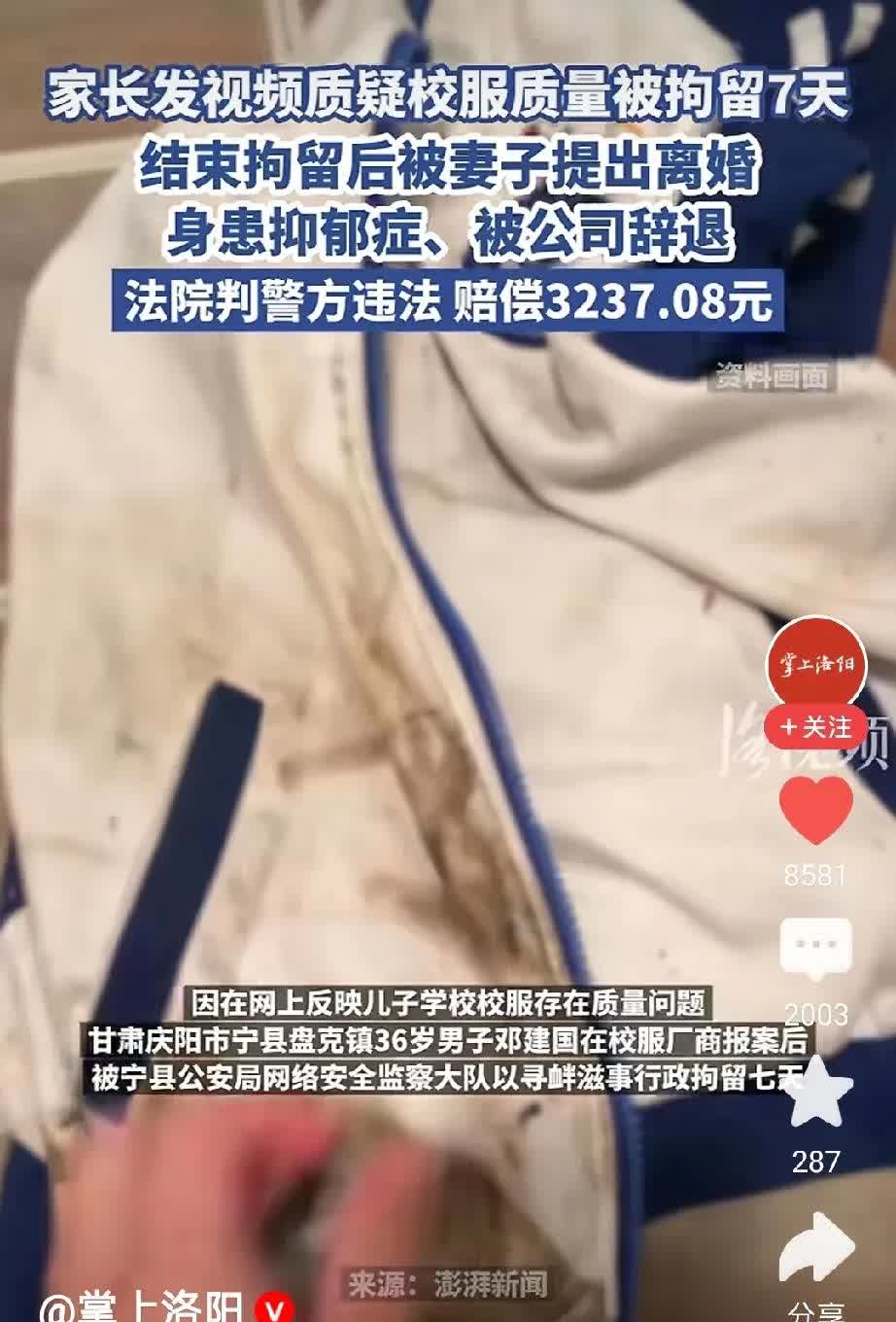 太离谱!一男子竟然因质疑校服质量问题,被拘留7天!结束拘留后,被妻子提出离婚,身患抑郁,被公司辞退,法院判警方违法,赔偿了3237.08元! 这世界是不是太荒唐?一个错误的决定就要毁人一生,迟来的正义还是正义吗?一个家庭,一个男人就这样被毁了!最可怜的还是孩子,无辜的他还什么都不知道,就没了完整的家!