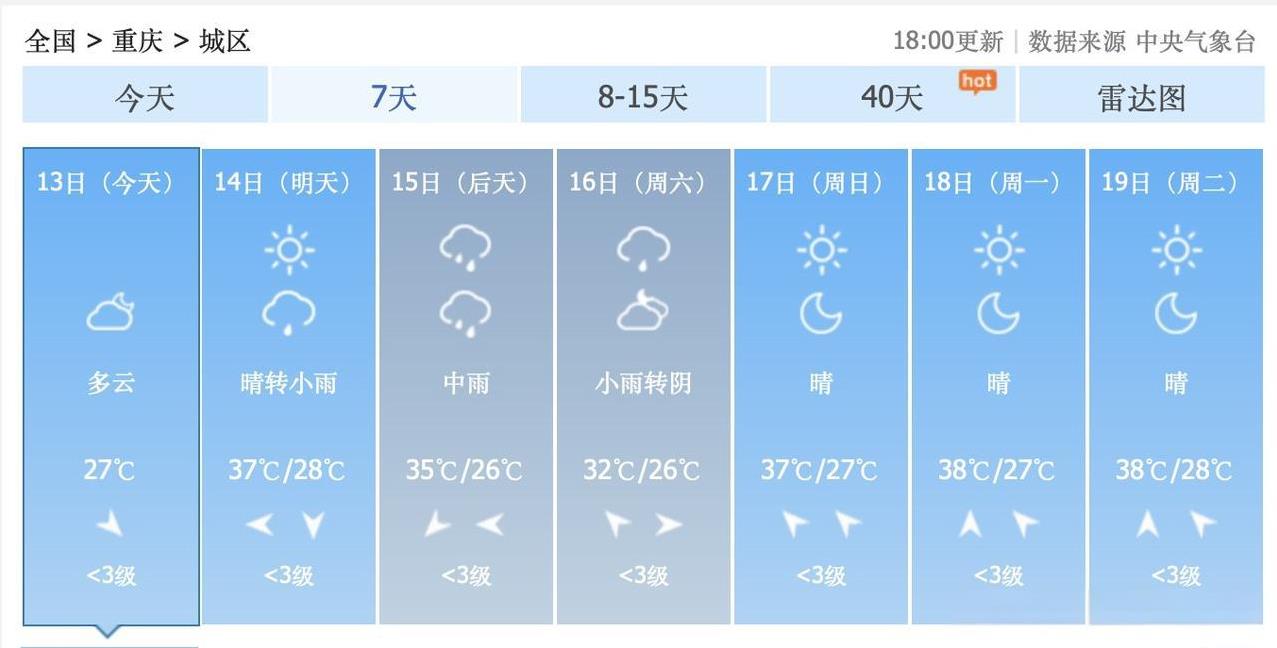 噢!我的个天啊!台风杨柳,真的要给重庆带来降雨啦!8月14日,星期四晚上,重庆小雨!8月15日,星期五,重庆中雨……8月16日,星期六,重庆小雨转阴…… 也就是说,8月16日白天,重庆主城区及周边的仙女山金佛山,大概率是阴天…… 8月17日,星期天,重庆主城区,晴天,气温27-37度,这是比较适合去南川金佛山178环线旅游的,还好还好! 不过,台风最新路径依旧在变化中,台风对于西南地区的具体影响,大家还是要每天关注最新天气预报! 好吧,这周末,重庆人,应该是可以去仙女山金佛山露营游玩的,只是8月15日星期五晚上应该不合适。#光线摄影世界曾兰谈天说地# #头号创作者激励计划#