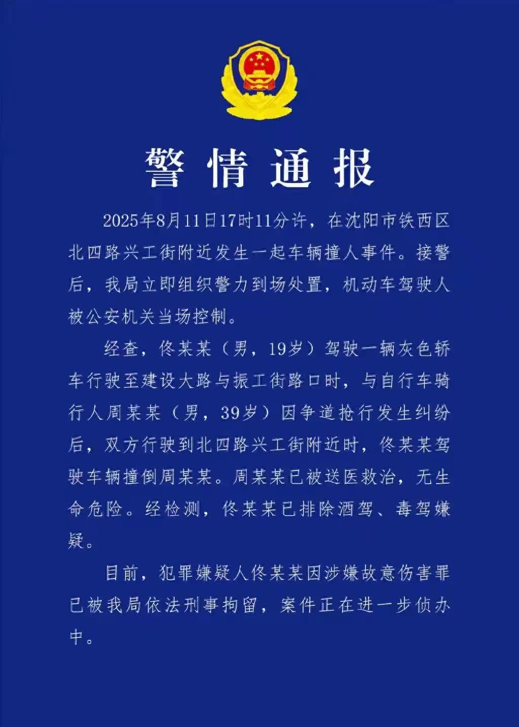 没人治你,零零后治你,也终将为自己的年轻气盛付出惨痛代价。 沈阳零零后与骑自行车的中年男子因争道抢行发生纠纷,随后零零后开车撞向中年男子,男子已送医院救治,零零后也被刑拘。 因一点小事酿成大祸,零零后为自己的行为负责!