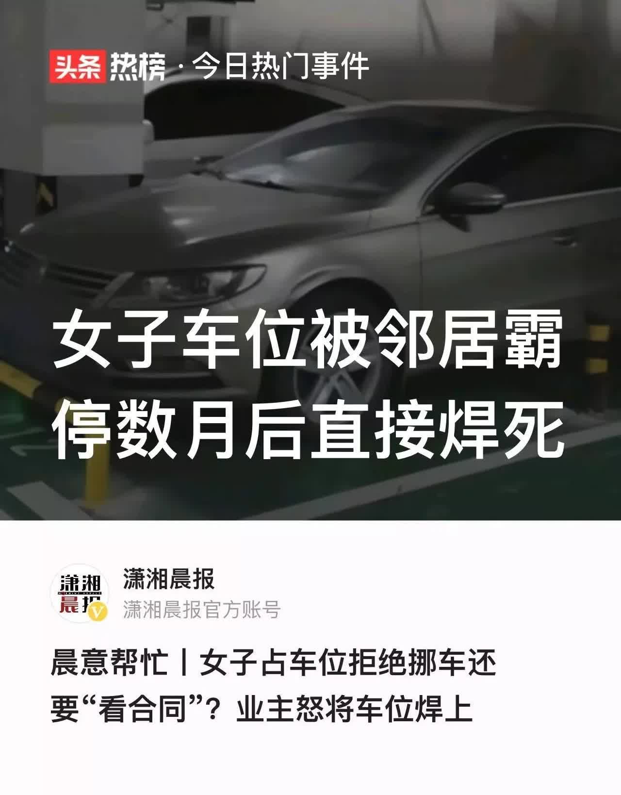 太无赖!湖南长沙,一女子的车位被邻居霸占3个月,当她要求对方挪车时,对方竟然要求她提供购买合同!女子认为对方简直就是无赖之举,既然你不仁,就别怪我不义,一气之下,她把自己的车位焊上了铁栏杆。 在湖南长沙的一个小区里,刘女士为了方便自己停车,特意买了一个地下车位。可没想到的是,有一天她下班回来,发现自己的车位被别人的车给占了。刚开始,刘女士还以为这只是临时停一下,就没太当回事。结果这一停,就是整整三个月。 刘女士尝试了好几次找车主挪车,但车主一直拖拖拉拉,不愿意动。更过分的是,车主还让她拿出车位的购买合同,才肯把车开走。这让刘女士非常生气。她去找物业投诉,也报了警,但事情还是没能解决。 最后,刘女士实在没办法了,就在车位周围焊上了铁栏杆,这事儿一下子就在小区里炸开了锅。她一生气,就做了个挺大胆的决定:在车位周围焊上了铁栏杆,把车结结实实地“圈”在了里面。她说:“你不讲理,那我也只能这么办了。” 这事儿很快就引起了大家的注意。说起来,刘女士手里有车位的正规购买合同,这车位就是她的,她想怎么用就怎么用。可那位车主老占着不走,这就有点儿欺负人了,算是侵权。 不过,虽然刘女士焊栏杆是为了维权,但这么做也确实有点儿争议。要是没挡着别人的道儿,只是在自家车位上动动手脚,法律上倒也能说得过去,就是这做法不太合适。最后,物业和警察来帮忙调解,车主没办法只好把车开走了。刘女士那边呢,她的铁栏杆也被拆掉了。这场抢车位的“大战”最后是靠法律来解决的,也提醒大家,维权得讲理。