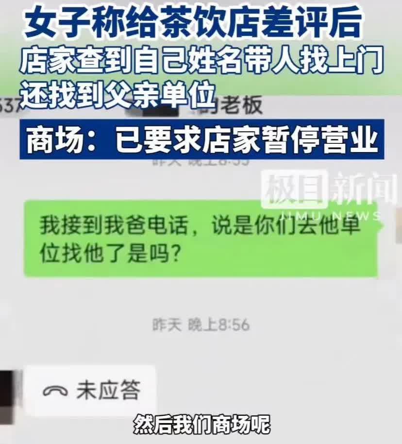 黑龙江 齐齐哈尔,一女子买茶饮过程中,因对服务员态度不满,在第三方平台上给出差评,女子的评论立刻有“要饭还要嫌馊”等替店员打抱不平的回复,女子怀疑是店员回复的,并未理会。随后,茶饮店老板不知通过什么方法,查到女子的家庭住址和电话,竟找上门去,强迫女子开门,当面道歉。被拒后,又找到女子父亲单位。女子非常气愤,在网上曝光此事。目前,该茶饮店已经被迫停业。 在黑龙江齐齐哈尔,有个关于消费者给差评后遇到麻烦的事儿。,2月2号,刘女士在一家商场的茶饮店想买杯饮料,因为感冒就选了个正常杯,结果跟店员为了赠品小鸭子闹了点不愉快。店员说小鸭子只能送买“霸王杯”的顾客,刘女士还没想好要不要换,店员就直接把小鸭子拿走了给了别人,这让刘女士觉得被区别对待了,服务态度也不好。 过了几天,2月5号,刘女士就在一个大家常用的平台上写了篇差评,把这事儿的前因后果都说了。结果评论下面很快就有人骂她,说的话可难听了,像“要饭的还挑三拣四”之类的,刘女士猜可能是店员干的,但也没当回事儿。没想到,茶饮店的老板不知道从哪儿知道了刘女士家的地址和电话,直接找上门来,让她当面道歉。刘女士当然不肯了,结果老板又跑到她爸爸单位去闹。这下刘女士可生气了,觉得自己隐私都被侵犯了。2月7号,刘女士把事情的经过做成视频发到了社交网站上,一下子引起了好多人的关注和讨论。后来,那家店因为大家议论纷纷,只好关门停业了。店里的员工一晚上接到了快200个骚扰电话,生活全被打乱了。当地的监管部门出来说话,说他们没有查到食品安全问题,至于服务态度,他们管不了。 现在,这家茶饮店正停业整顿呢,事情还在越闹越大。顾客有权利表达自己的不满,但商家也得冷静回应,不能去骚扰别人隐私。大家在关注这件事的时候,也得保持理智,别乱发脾气去网暴别人。