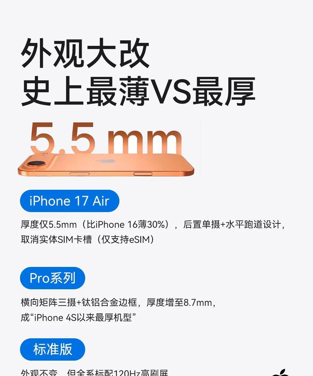 苹果17系列配置曝光,今年的苹果17是值得购买的。 根据媒体爆料,今年的苹果17终于告别了祖传的60赫兹屏幕刷新率,用上了120赫兹屏幕刷新率,在上下翻页的时候会更加流畅丝滑,没有停顿和重影体验会更加一些。 看了一下配置参数,苹果17air和pro系列销量注定不会太高,没有什么亮点可言,价格还卖这么贵。 苹果17和苹果17promax应该会卖的比较好,有钱的会买promax版本,没钱的又想买苹果手机的买苹果17,另外两款属于高不成低不就,特别是air版本,电池容量这么小,续航能力肯定差,牺牲电池容量换机身薄2毫米得不偿失。
