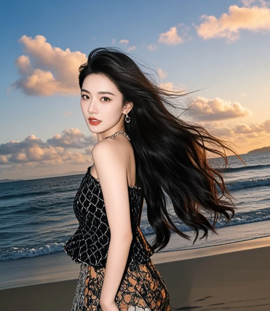 长发美人,踏浪而来,裙角沾满阳光的碎金