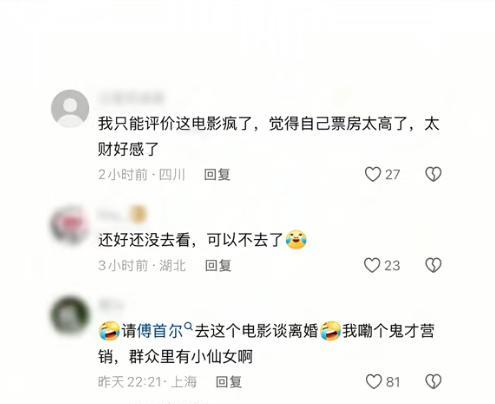 一觉醒来, 《浪浪小妖怪》导演的天塌了! 票房过五亿还在上涨,却有不少人想要退票! 原因竟是宣发队伍邀请了傅首尔和苏敏进行宣传。 傅首尔在宣发现场结合自身离婚经历,谈起自己与儿子关系,称“13岁的孩子已具备独立人生观”,根据自己的理解把电影理解成“个体追寻自我价值”“人生是旷野,不存在跑偏”! 苏敏更是呼吁“猪妈妈也该离开浪浪山”,将片中照顾瘫痪丈夫坚守家庭的“猪妈妈”,类比成了“逃离家庭”的自己。 两人的观点让网友产生了质疑,电影主打的是“家庭温情”“亲情羁绊”的观点,被傅首尔和苏敏打上了鲜明的“逃离家庭”标签! 有网友表示“早知有她,绝不买票”,甚至有人在豆瓣打出一星差评! 一场电影宣发,本来是为了更好的票房,结果把电影推向了观众抵制的局面。 本来超过五亿票房还在上涨,但经过这么一闹,导演都郁闷至极了吧! 这事你怎么看?