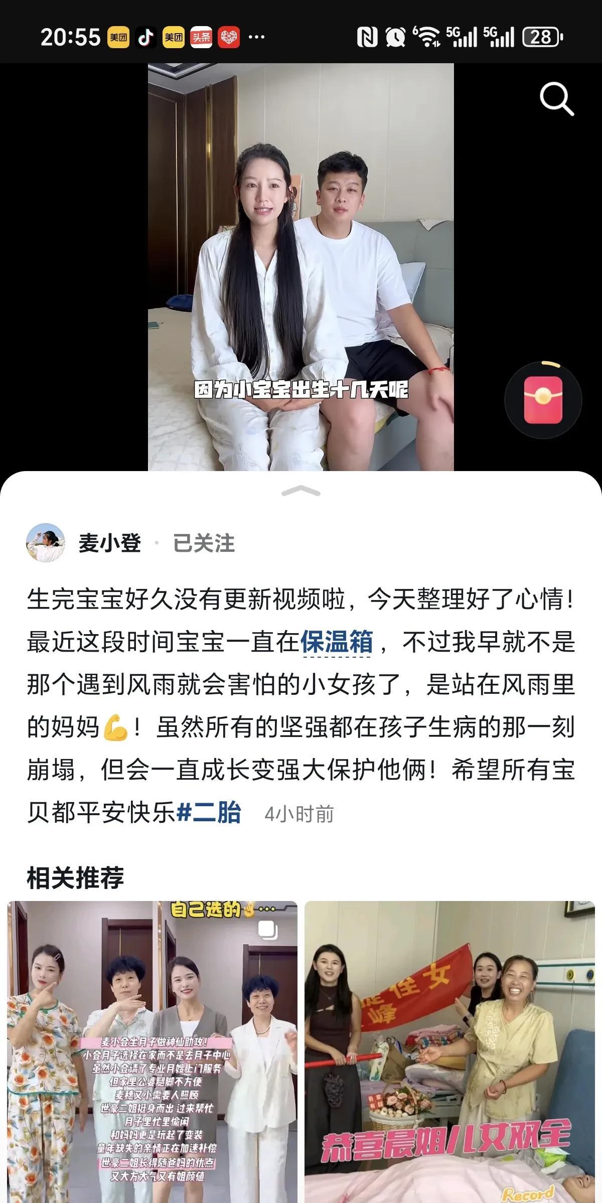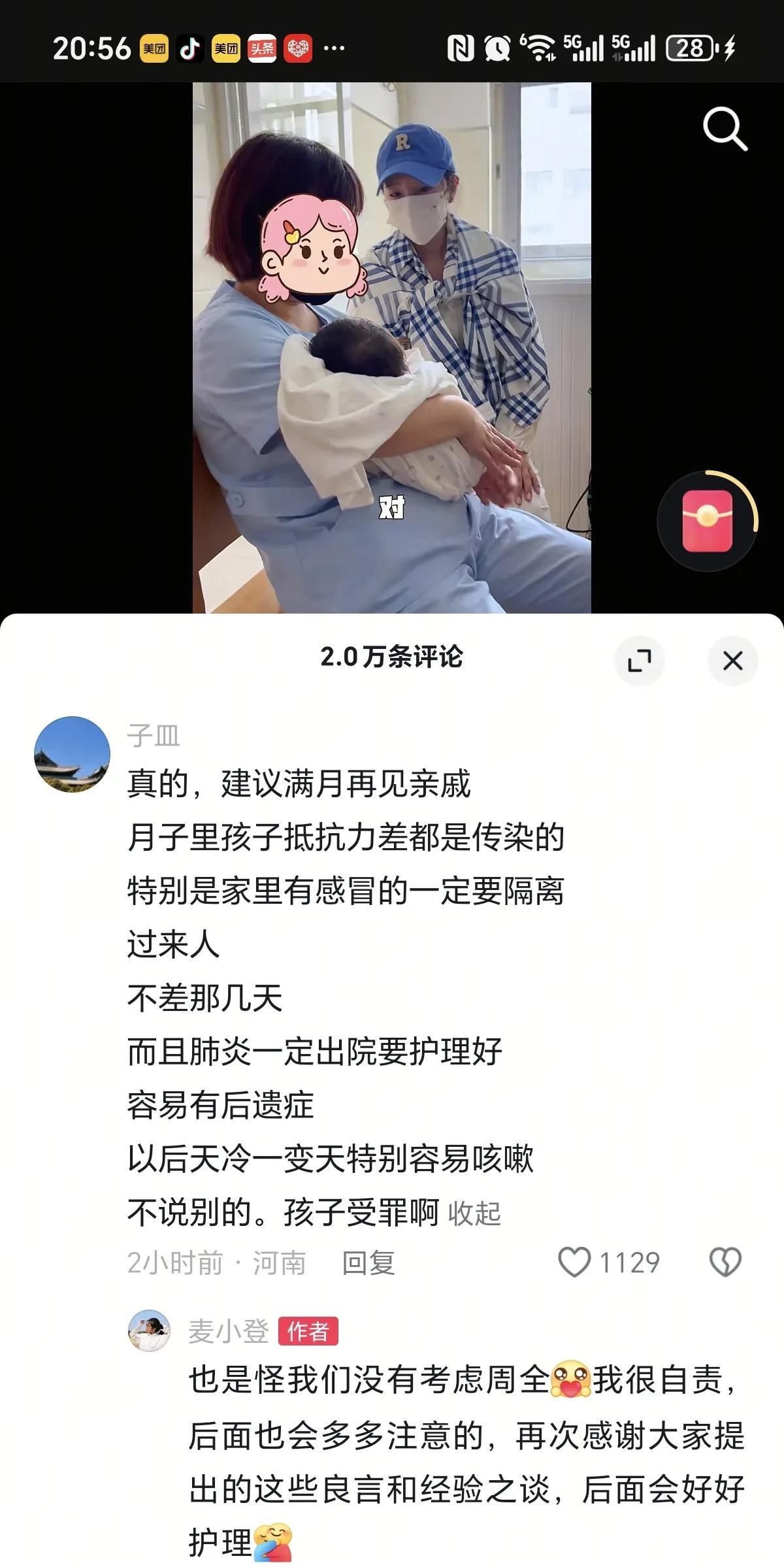 麦小登二胎,一直在保温箱, 这是发生了什么? 很久不发视频的麦小登, 今天哭的不能自已, 还没出月子, 孩子就肺炎住院了! 真被网友说中了, 刚出生的小宝宝, 体质太弱了, 不要这么多人去看望她! 麦小登生完二胎, 很多嫌弃亲戚朋友太冷漠, 不去看望小宝贝的! 这不成群结队的去看望, 出事了吧! 麦小登评论区问真挚的向大家道谢, 感谢大家的仗义执言! 这次生病后, 估计要好好坐月子了, 谢绝亲戚朋友看望了! 做自媒体为了流量啊! 都蹭流量, 结果刚出生的宝贝, 只能保温箱里了!