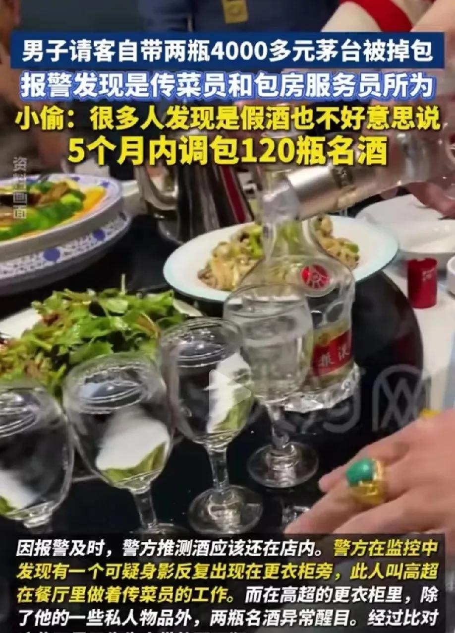 上海,男子商务宴请,自带了两瓶茅台酒,吃饭期间,他发觉酒的味道不对劲,赶紧拿出买酒时拍下的防伪码照片进行比对,发现他拿来的茅台确实被掉包了,而且还是两瓶假酒。男子找餐厅老板理论,老板坚称他们不会干这样的事,服务员也表示不会为了这点钱丢掉工作。民警经过调查,果然发现了大秘密,顺藤摸瓜查出120多瓶被盗的名酒。 8月13日,大河网报道了一起离奇事件,王先生怎么也没想到,自己精心准备的宴请会因为两瓶茅台酒闹得鸡飞狗跳,更没想到背后竟藏着餐厅员工的惊人黑幕。 事发当天,王先生为了宴请重要客人,特意花4000元买了两瓶茅台酒。 他是个懂酒的人,平时没少喝茅台,为了避免买到假茅台,他还特意拍了酒瓶上的防伪码留底。 来到餐厅后,王把酒交给了包间的服务员,还特意交待得把这酒看好了,别出什么岔子。 宴请开始后,王先生举杯敬客户,怎料,他刚抿了一口酒,眉头就皱了起来。 他心里咯噔一下,这酒的味道可不对劲,很明显是假酒。作为经常喝茅台的老饕,他对茅台的口感再熟悉不过。 再仔细看看酒瓶,虽然也是2025年的名酒,但防伪码和自己拍下的完全不一样,而且瓶身有些细微的划痕,显然不是自己带来的那两瓶。 王先生叫来服务员,带着怒气质问这酒到底是怎么回事? 服务员脸色一变,支支吾吾的说不出所以然。 王先生立刻找到餐厅老板讨要说法,老板却拍着胸脯保证:餐厅绝对不可能发生这种事! 既然都不承认,那就查监控,用证据来说话。 可谁知,这家餐厅为了照顾顾客的私密性,监控摄像头装得很少,走廊的监控都没有内存卡。 查看了一遍监控,结果一无所获。 餐厅前厅主管,也是王先生包间的服务员小高也赶来解释:她是餐厅的主管,不可能为了这点钱丢掉工作!她保证这酒就是王先生带来的。 都说没问题,但酒确实不是他买的那两瓶,这其中肯定有猫腻。 王先生没办法,果断报了警。 警方到达后,根据作案时间推测,这两瓶真酒应该还在餐厅内,于是他们再次查看仅有的几个监控画面。 民警果然经验丰富,很快就从监控中心锁定了一个可疑身影,他们发现,传菜员高某反复在更衣柜旁徘徊。 警方立刻展开调查,要求打开高某的更衣柜检查。 果不其然,高某的更衣柜里面赫然放着两瓶茅台酒,从防伪码来看,正是王先生丢失的那两瓶。 证据面前,高某终于松口,交待了案件的事实。原来,是王先生包间的服务员兼前厅主管小高和他合伙干的。 这对“搭档”一个在包间服务观察,一个在后厨配合,专门对自带名酒的顾客下手。 警方随后在高某和小高的电瓶车储物箱、更衣柜里进行搜索,竟然发现有几十瓶各种年份、不同版本的假名酒。 两人交代,从入职以来的五个月里,已经掉包了120多瓶名酒! 之所以敢这么肆无忌惮的偷酒,是因为很多人发现是假酒也不好意思说,两人这才越来越大胆。 戴上手铐的那一刻,两人这才意识到问题的严重性,瘫坐在地上。 最终,高某和小高因涉嫌盗窃罪被检察机关批准逮捕。 对于此事,高某和小高会面临什么法律后果呢? 1、高某和小高的行为构成盗窃罪,后果非常严重。 《刑法》第264条规定:盗窃公私财物,数额较大的,处三年以下有期徒刑、拘役或者管制;数额巨大或有其他严重情节的,处三年以上十年以下有期徒刑。 服务员高某与小高在客人不知情的情况下,用假酒调包真酒,属于典型的“秘密窃取”行为。 两人将价值4000元的真酒替换为成本低廉的假酒,并将真酒倒卖牟利,符合非法占有目的。 而且,两人5个月内调包120多瓶名酒。若按单瓶市场价4000元计算,总金额高达48万元以上,远超“数额特别巨大”的标准。 这样看来,高某和小高可能面临十年以上有期徒刑或无期徒刑。 2、餐厅存在管理漏洞,需要承担民事赔偿责任。 餐厅以“保护隐私”为由减少监控设备,甚至走廊监控无内存卡,属于重大管理漏洞。 服务员长期作案未被发现,也与餐厅未履行安全保障义务直接相关。 若顾客向餐厅索赔,餐厅需要承担补充责任,要求老板赔偿酒款或支付合理维权费用。 老板只顾着拍胸脯保证,没想到自己的员工竟然监守自盗,实在是有些打脸。 出现这样的事,餐厅连酒都能掉包,还有什么值得顾客信任的呢?