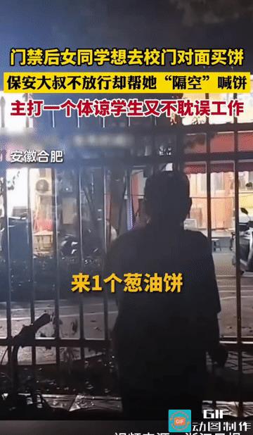 “这保安大叔太可爱了!”安徽合肥,晚上门禁过后,女同学想出去到校门口对面买饼,被保安大叔拒绝放行后,女同学明显就不高兴了,可下一秒保安大叔一句话瞬间又让她所有的不开心烟消云散了! 来源:【浙江日报】 为了学生们的安全,校园内设置了门禁时间,每天时间一到,学生们都不得出去了! 可当天晚上,女生觉得有些饿了,便想出去买个饼吃一下,她也知道有门禁,门口还有保安看守着,但她想着反正那个卖饼的阿姨就在校门口,她出去后,保安也看得到,应该没事,所以,她毫不犹豫的来到校门口,找到保安大叔说明了来意! 然而,这保安大叔也是非常尽责,毕竟已经到了门禁时间,他不可能私自放学生出去,即使只是隔了一条马路,他也要遵守原则! 被拒绝后的女生没想到这大叔如此固执,心里就有些不开心了,没学没想到的是当她正准备返回宿舍之时,却听到了保安大叔来到铁门前朝着对面卖饼的大姨喊了一句:“来一个葱油饼,女同学的!” 听到这话,女生刚才还垂头丧气的脸立马又变得喜笑颜开了,乖乖的待在一旁等待着! 过了好一会儿,那卖饼的大姨还没把饼送过来,保安大叔还出面帮着催了催! 不得不说,这保安大叔这一操作可真是神了! 如果放女生出去,就是自己的失职,要是真出了什么事,可就真的难逃此咎了;但不放女生出去,而且就在对面,这又显得自己不近人情,很难相处,说不定还要面临投诉,在左右为难之际,保安大叔灵机一动,主动帮女生喊了一句! 这既没有让自己失职,又缓和了和学生之间的关系,让女生顺利吃到了饼,这简直就是一举两得啊! 看到还有网友说,这女生肯定是新生,一点都不专业,上学第一天就应该把学校附近的小吃店老板的联系方式全都加上啊,这样想吃什么不就是一句话的事吗? 但反过来说,这保安大叔的做法确实是对的,这大晚上的不让女生出去,这就是在对她的安全负责,这也是他的职责,是他尽职的表现,但他下一秒又帮女生买饼,这又体现了他的温度! 这样尽职尽责又饱含温度的保安大叔,可真是太可爱了! #万能生活指南#