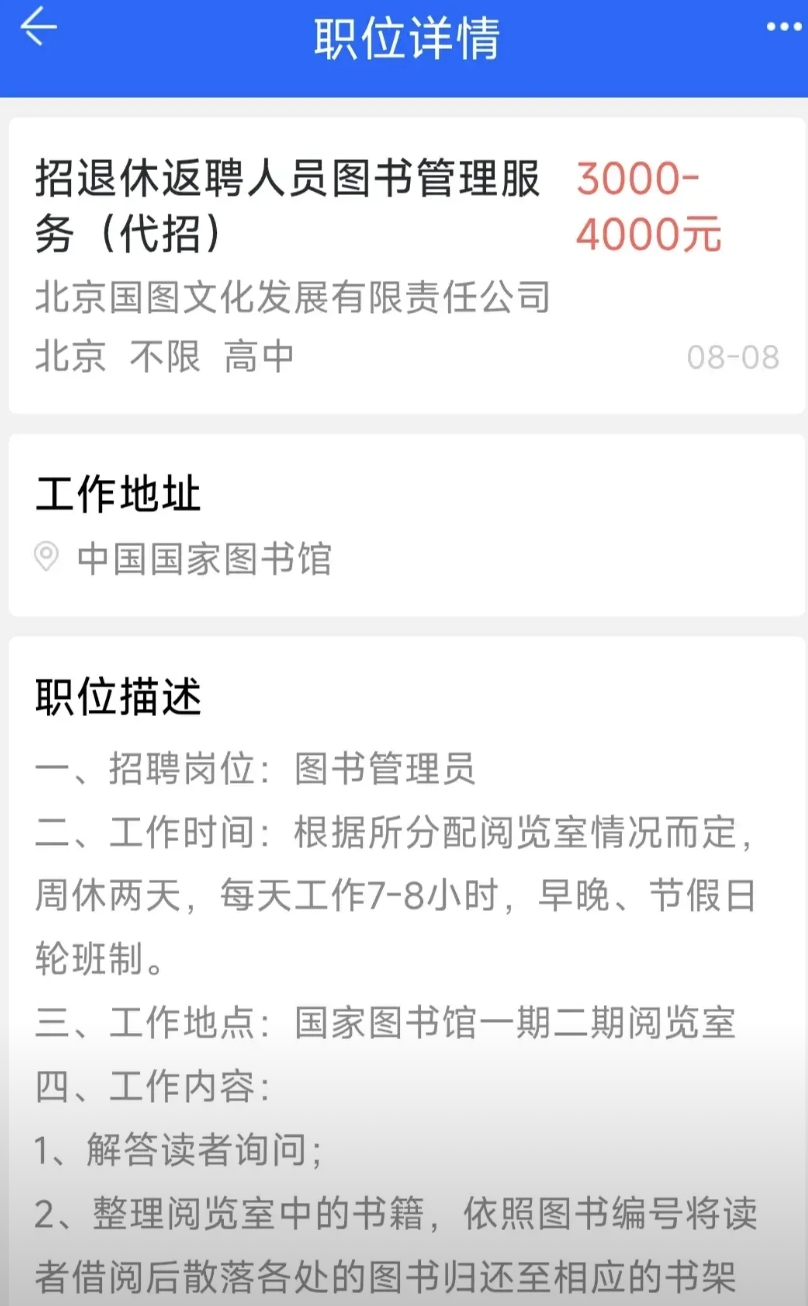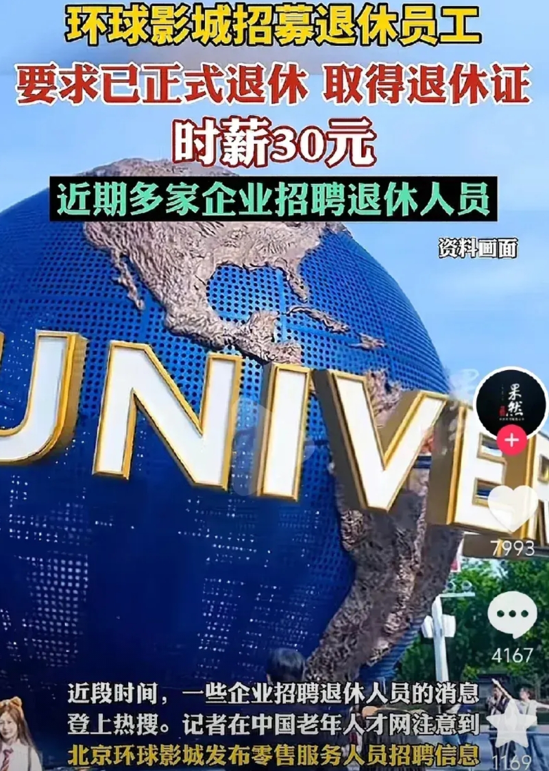 该来的还是来了。因为企业要给员工全员交社保,所以最近就看到很多招聘退休人员的广告。 当然这些工作以体力劳动、粗活为主。 麦当劳、环球影城、国家图书馆……一般都招聘50到60岁的退休人员。工资3000到4000元。 这里面我一眼就看中了图书馆管理员的工作。招聘写明要50到52岁能干体力劳动的,因为要搬书、分门别类码书,确实需要些体力。估计这个岗位要挤破头,我也不去试了。 对于我们退休人员 个人,真的是喜大普奔,能出来活动、能挣钱、发挥余热,很多人都跃跃欲试。但我却在高兴中有点担心。我们再就业,用人单位不用交保险,好管理,能吃苦,肯定受欢迎。我们的孩子怎么办?中低端工作中老年人做了,年轻人怎么办?在家啃老吗?而且啃的名正言顺,毕竟我们抢了他们的饭碗。 也许我多虑了,反正我真的高兴不起来。
