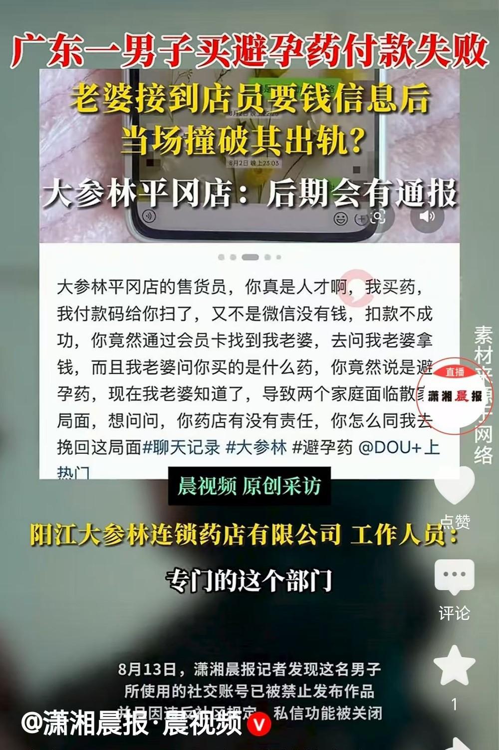 广东阳江,一男子到大药房买避孕药,付款时让店员扫码支付,谁知系统出现故障,没扣款成功,店员根据会员资料,打电话问他妻子要钱,妻子问买的啥药,店员说避孕药,结果,男子出轨的事被妻子当场抓到,事情闹大,两个家庭面临解体,男子报警,说他权益受到侵犯,要告店员,还把视频发到网上,被人举报,网友: 这种事居然敢用老婆的会员卡,省两毛钱,真是个大聪明! 2025年8月13日,据潇湘晨报·晨视频报道,一男子找小三,为了省钱,用妻子会员卡买避孕药。 男子偷偷摸摸,在外面找了个情人,俩人都有家庭,抽空就会在外面约会。 男子做事谨慎小心,很长时间妻子都被蒙在鼓里。 男子既想寻找乐子,又不想负责,怕惹麻烦,被妻子知道。 男子趁妻子不备,再一次出门约会,谁知云雨过后,发现出了漏洞。 他怕情人怀孕,他可不想招惹麻烦,万一情人赖着他要钱,他可承担不起费用。 他急急忙忙赶到药店,要店员给他拿一盒左炔诺孕酮片,这个药又名金敏婷,是一种紧急避孕药,仅能在特殊情况下使用。 这盒药原价16元,如果使用会员,就能便宜两毛钱,买下来就是15.8元。 男子抠门,像葛朗台一样,为了省这两毛,他竟然用了妻子的会员卡购买。 他拿到药后,打开手机要店员扫码支付,店员扫过之后,男子拿着药就走了。 谁知该他出事,药店系统出了问题,扫码支付没有成功,扣款失败,店员发现时,男子已经离开。 于是,店员根据会员资料,上面留的是妻子的电话号码,店员打来电话,要求妻子把药钱付了。 妻子没有买药,听到店员要钱,急忙问他买了啥药,店员告诉她说,是一位男子,用她的会员卡买了一盒避孕药。 妻子和店员加上联系方式,店员给她拍下买药的小票。 妻子一看,小票上清晰的显示: 数量1盒,品名左炔诺孕酮片,规格1.5mg*1片,合计16.00元,折扣0.2元,实付15.80元。 妻子心里顿时明白了,这药她没有见过,更没有用过,丈夫在外有了别人,自己一直被他蒙在鼓里。 妻子万分感激店员,让她明白发生了什么。 她还询问店员,药品是在几点买的,店员告诉她说,9点30分买的。 聊天记录上显示,妻子和店员的对话是在8月2号晚上10点左右,妻子向店员谢谢,我应该感谢你。 店员回了个捂脸的表情,她也不知道会出这样的事情。 随后,妻子把男子出轨之事,逮了个正着! 妻子手握证据,男子无法抵赖,妻子要和他离婚,情人的家庭也保不住了。 原来,男子和情人,都是有家庭的人,他们哪里来的真情,不过是彼此之间玩玩罢了。 眼看两个家庭面临解体,男子怕了,虽然他在外玩耍,可是要他离婚,他才不肯。 在他心里,还是妻子最为重要,妻子虽然无滋无味,可是她温柔贤惠,别的女人比不上她。 她在家里,做牛做马,伺候完老的,伺候小的,家里打理的井井有条,持家有方,没有妻子的操劳,他哪里有时间出去潇洒。 孰轻孰重,他心里明镜似的,外面的女子只能当做调料。 可是,事已至此,来不及了,妻子怎能咽下这个苍蝇。 情人的家也要散了,如果情人离婚,肯定会缠着他没完。 男子越想越气,瞬间在心里腥风血雨,他没任何的悔意,反而怪店员给妻子打了电话。 他在网上发布视频,责怪药店售货员告诉妻子,他买避孕药了,导致两个家庭面临解散,他要药店承担责任。 8月11日17:06分,男子报警,说他的权益被侵犯,他要去告店员。 随后,男子的账号被人举报,被禁止发布作品,私信功能都被关闭,这是活该,恶有恶报。 记者电话联系了药店,药店表示,会有专门的部门处理这事。 8月13日晚上,记者收到回电,药店表示,因涉及客人隐私,药店不便接受采访。 记者又联系警方,警方回复,他要告店员,要去法院了解,我们管不了。 那么,这件事在法律上是怎么认定的呢? 《民法典》第1032条规定:自然人享有隐 私权,任何组织或者个人不得以刺探、侵扰、泄露、公开等方式侵害他人的隐 私权。 《民法典》第1034条规定:自然人的个人信息受法律保护。 男子购买避 孕 药的行为属于个人隐 私,但店员联系妻子追讨欠款时,透露了药品名称及购买事实,可能涉及隐 私 泄 露。 然而,店员的行为需结合以下因素判断合法性: 1、会员卡登记信息:男子使用妻子名义办理的会员卡,药店系统记录的联系方式为妻子电话,店员基于合同联系持卡人,属于合理履约行为; 2、目的正当性:店员联系妻子旨在追讨未支付的货款,而非故意公开yin私,主观上并无恶意; 3、信息必要性:在扫码支付失败后,店员需通过会员资料联系付款人,符合交易惯例。 4、追讨对象:因会员卡登记人为妻子,店员联系妻子系基于“表见代理”的合理推断,以为妻子是实际购买人,不违反法律规定。 因此,店员行为不构成隐私侵权。 对此,你怎么看?欢迎评论区留言讨论。关注@王哥说法 #头号创作者激励计划#