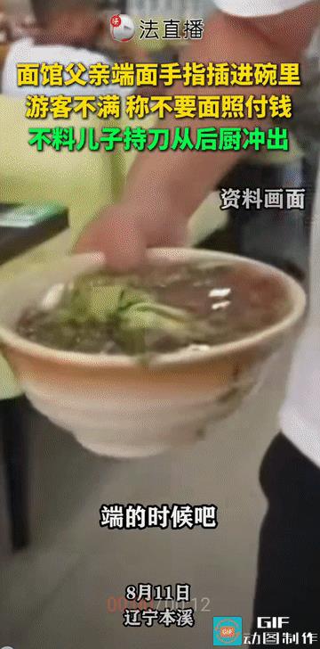 “太极端了!”辽宁本溪,男子与朋友到面馆吃东西,面被端上来时,男子注意到老板的整个手指都插进了面汤里,男子当下就说面他们不要了,但面钱他们照付,不料老板的儿子听说后,直接持刀从后厨充了出来! 来源:【河南法治报】 从视频也可以看到,这老板当时在给男子上面时,他一只手拿着一大碗面,估计是为了借力,他的整个大拇指都插进了碗里! 男子看见后,直接说了一句:“手指头都插面里了,我咋吃,面我不要了!” 老板一听这话,心里也有些不满:“手碰到汤能咋,就不能吃了?”紧接着就将面端回去了,一边走还一边埋怨。 男子听到后,心里也是有气,便又说了一句:“钱我照付,面我不要了,咋了?” 双方因此发生言语冲突后,后厨老板的儿子情绪激动,直接拿了一把刀冲了出来,所幸被众人拦了下来,没有发生大的事故! 而男子一行人见人家拿刀了,便直接报了警! 派出所民警到场后,认为该店员没有持刃伤人,希望双方调解,所以此事也没有立案也没有行政处罚,最后在民警的调解下,面店赔了1000元,男子一行人把单买了! 此事,引起了网友们的热议! 有网友说,做餐饮的最讲究的就是要干净卫生,直接把自己的手指插进顾客的餐食中 这就是大忌,真的太不讲究了! 有网友说,这明显就是店家的错,店家不主动换一份,还不向顾客道,反而觉得顾客不讲理,这是不是太过分了! 有网友说,这顾客都已经明确表示自己钱照付,但不要面了,有什么问题吗? 有网友说,这老板和他儿子不愧是一家人,还拿刀,这是想威胁他们吗?还真当自己是黑社会啊! 有网友说,这儿子对他父亲可真好啊,非要给人家赔100元才罢休! 那么,对于此事,大家有什么想法呢?