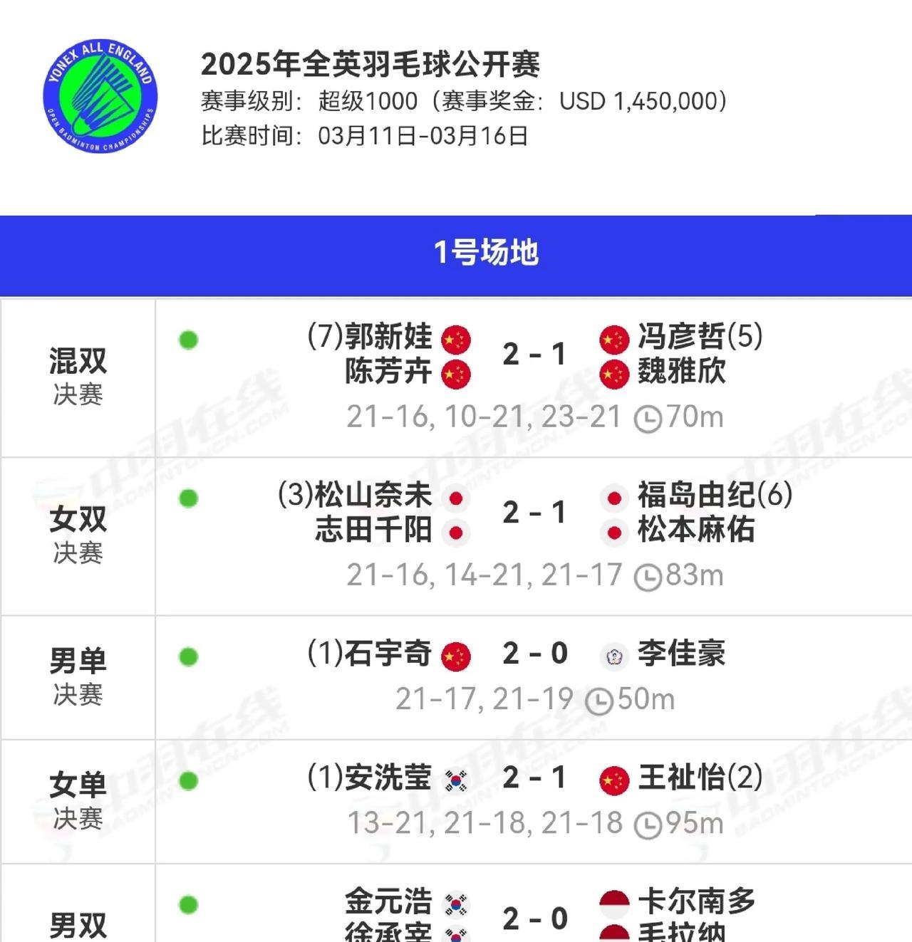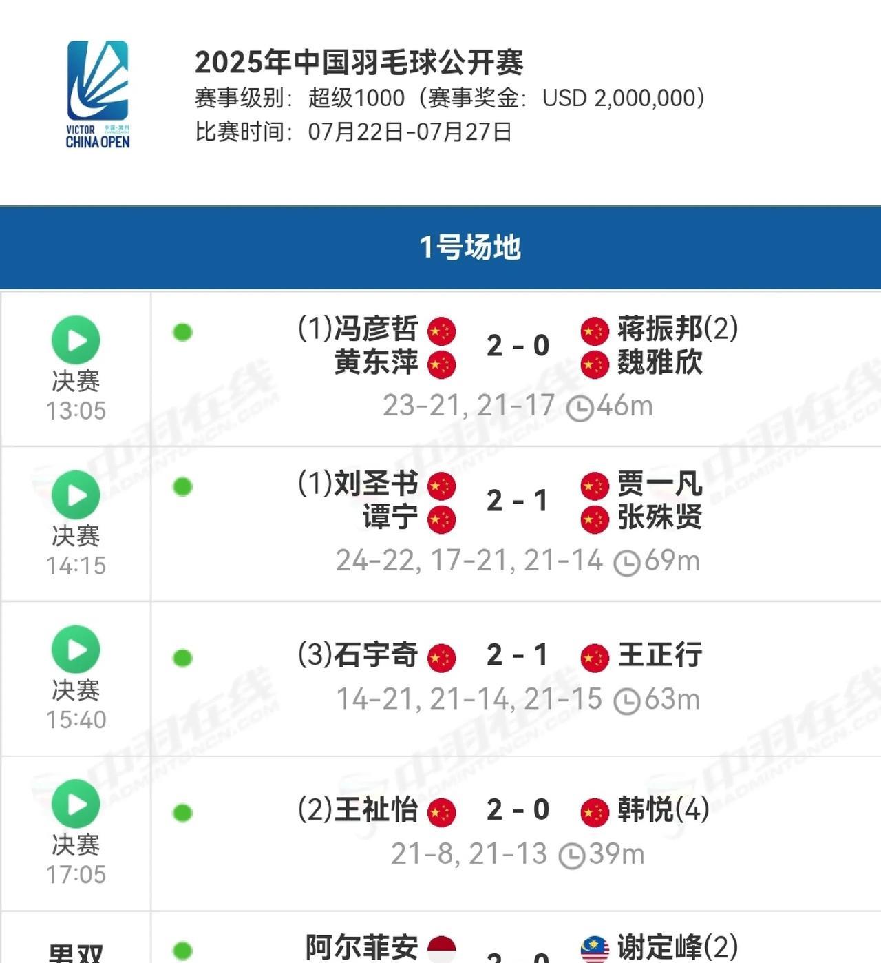 2025年羽毛球超级1000赛事回顾: 超级1000赛事4站:马来西亚公开赛+全英公开赛+印尼公开赛+中国公开赛。 球队统计: 中国队:8冠11亚。韩国队:6冠。 日本队:2冠1亚。 印尼队:1冠2亚。 泰国队:1冠1亚。 丹麦队:1冠1亚。 法国队:1冠。 马来西亚:2亚。 中国台北:2亚。 球员统计(国羽方面): 石宇奇:3冠。 刘圣书/谭宁:2冠。 王祉怡:1冠。 冯彦哲/黄东萍:1冠。 郭新娃/陈芳卉:1冠。 球员统计(其他球队): 安洗莹:3冠。 金元浩/徐承宰:3冠。 安东森:1冠1亚。 德差波/苏皮萨拉:1冠1亚。