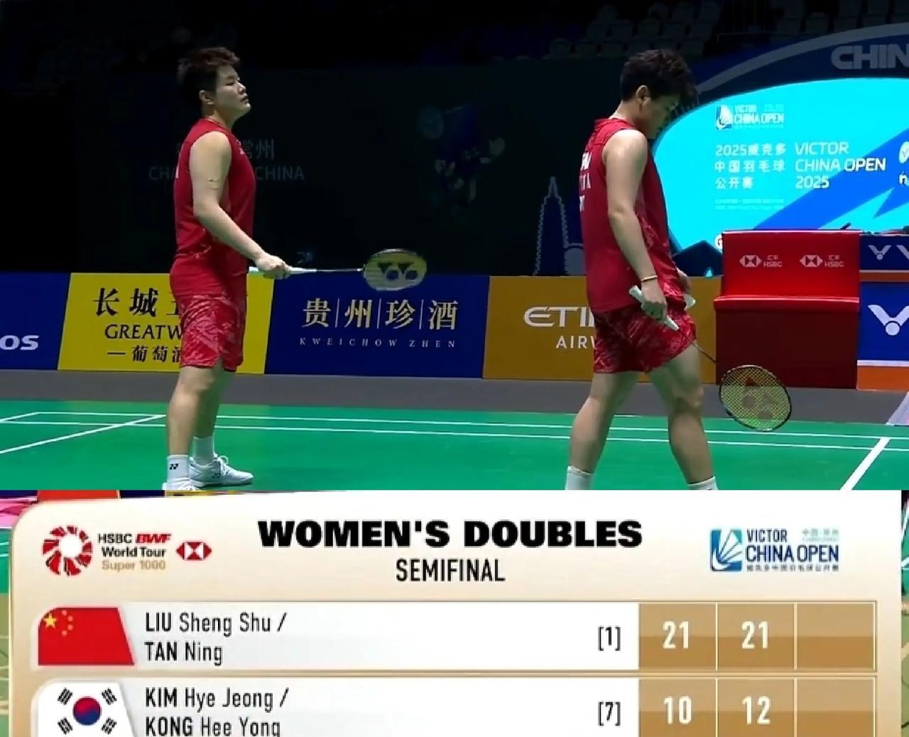 2025年中国羽毛球公开赛,贾一凡/张殊贤21-14,21-17战胜陈康乐/蒂娜,刘圣书/谭宁21-10,21-12战胜金慧贞/孔熙容,国羽女双会师决赛提前锁定本站冠亚军。