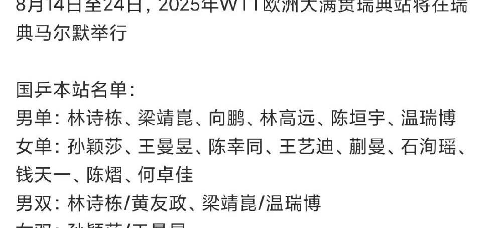 缺少王楚钦的瑞典大满贯,谁会顶上来? 北京时间15日晚上8点,瑞典大满贯将举行
