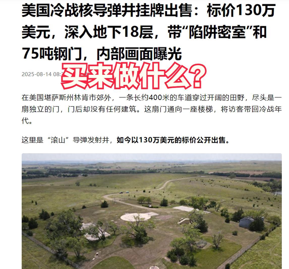知道“川普”爱钱,没想到这么缺[发怒][发怒] 居然把核导弹的发射井, 也拿出来公开叫卖,标价130万美元 这是60多年前修建的地下设施, 全部用钢筋混凝土浇筑, 这个巨大的圆柱大坑,上下18层楼高, 用于贮存并发射洲际弹道核导弹[炸弹][炸弹] 从地面的出入口,顺着楼梯下去, 经过一扇75吨重的铁门, 就是地下控制中心, 有两层高、总面积约232平方米[心][心] 控制中心有通道去往发射井, 位置是地下4层左右, 下面还有深达14层楼的落差,[流泪][流泪] 因为维护成本太大, 也基本上没有什么实际用途, 现在拿出来当做房产销售[捂脸][捂脸] 对于你们比较懂行的朋友, 这样的导弹发射井, 花费130万美元买下来后, 到底能用来干嘛? #万能生活指南##记录我的2025# #晒图笔记大赛#