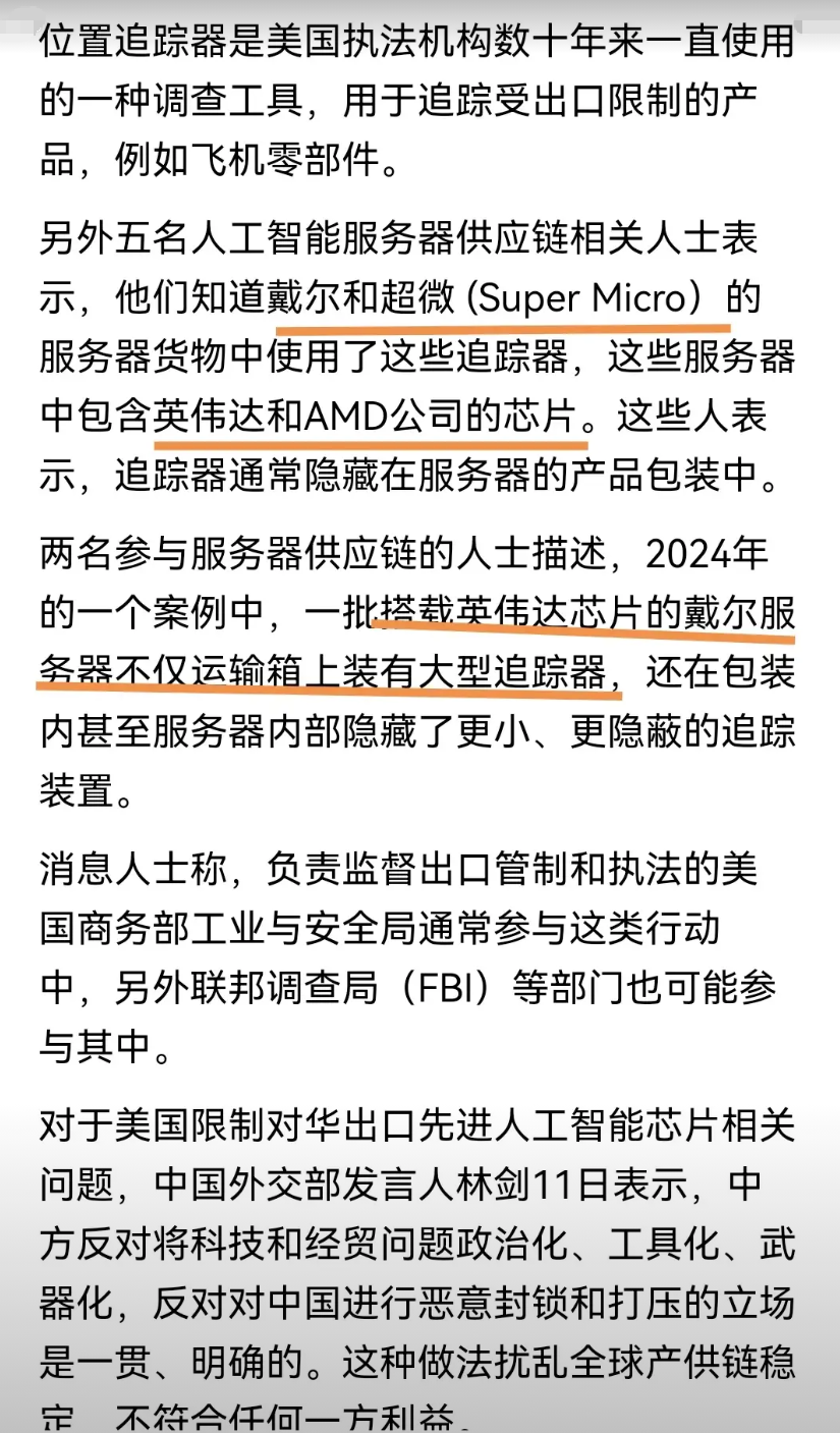 是在芯片的原厂包装里面加定位芯片不是在芯片里面加定位电路。正规厂家订货一般都要原厂真空包装,无论托盘还是卷带,带吸潮剂湿度色卡,防止上smt之后因为潮敏爆米花了。除非是个人做样机,否则谁也不愿意中途拆包装,这样就能追踪限制出口的芯片最终用户。即使没有封杀,原厂也有可能通过包装上的批次编码追踪最终用户,防止串货。只要合法使用其实不怕追踪器,如果是军工偷偷进口,可以半路费点劲换托盘再抽真空也行
