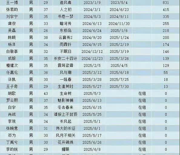 又有网友做男演员不进组的表格,我看了一下名单,都是有名有姓,有流量的,证明现在真的影视寒冬了?但是有一些人是刚刚杀青没多久的,没必要放上去吧?超过100天以上没进组才算,没有超过100天的,我觉得是正常过渡的时间。 王一博我印象中他一直有活动啊,没有闲着吧!张若昀前段时间不是哥哥官宣了新的剧,就等着开机吧!其他人不是在参加综艺就是开演唱会,可能现阶段没有适合他们的项目吧,在我看来就只有一个人是在认真抠脚的。