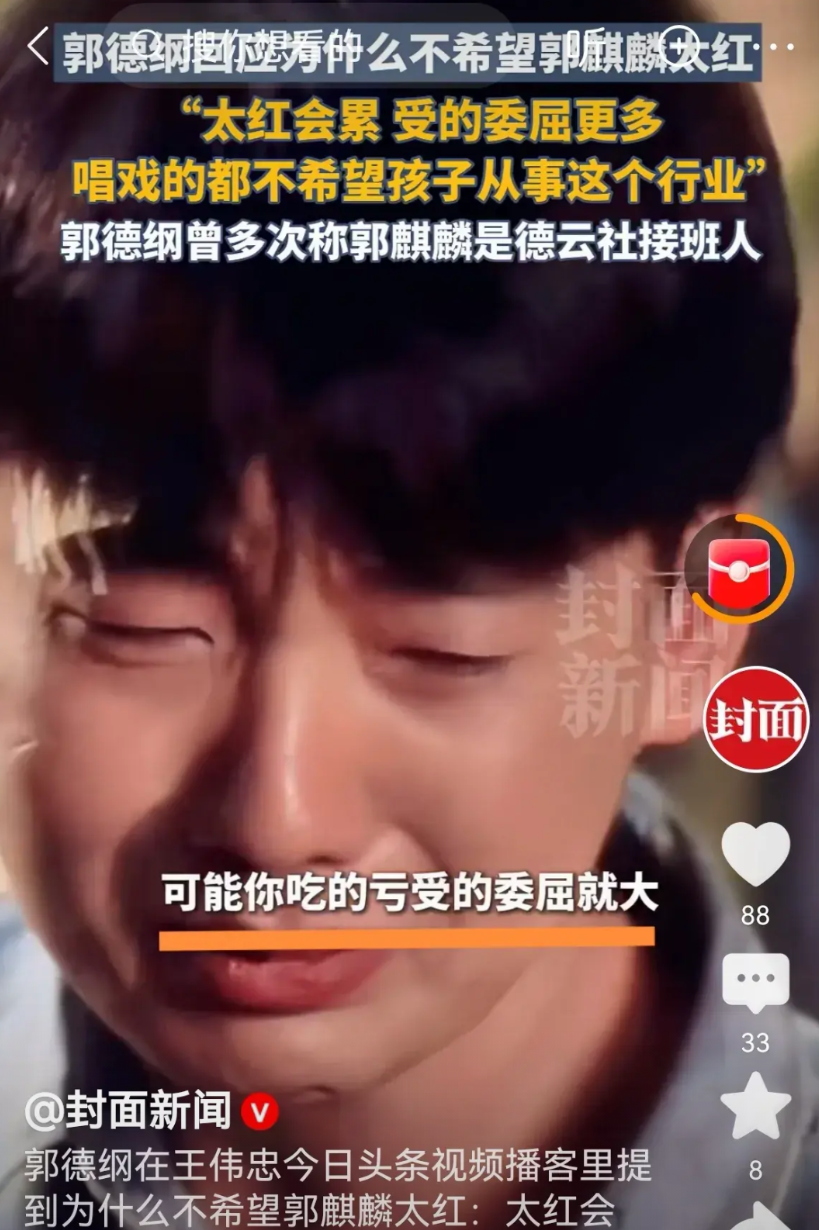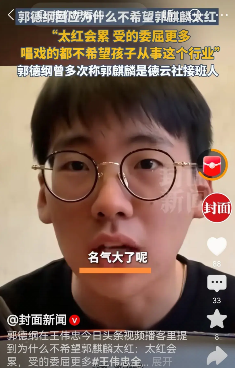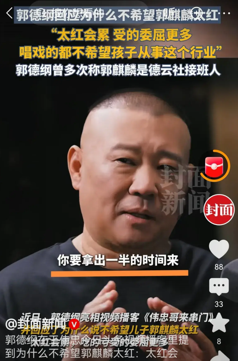 郭德纲最近回应为什么不希望大儿子郭麒麟太红时说:“进了这个行业(演艺圈),名气大了就要拿出一半的时间来应付很多跟艺术无关的事情,要吃很多亏受很多委屈,这样会很累。”