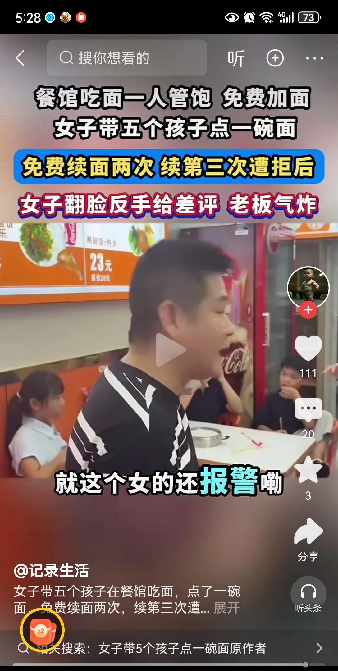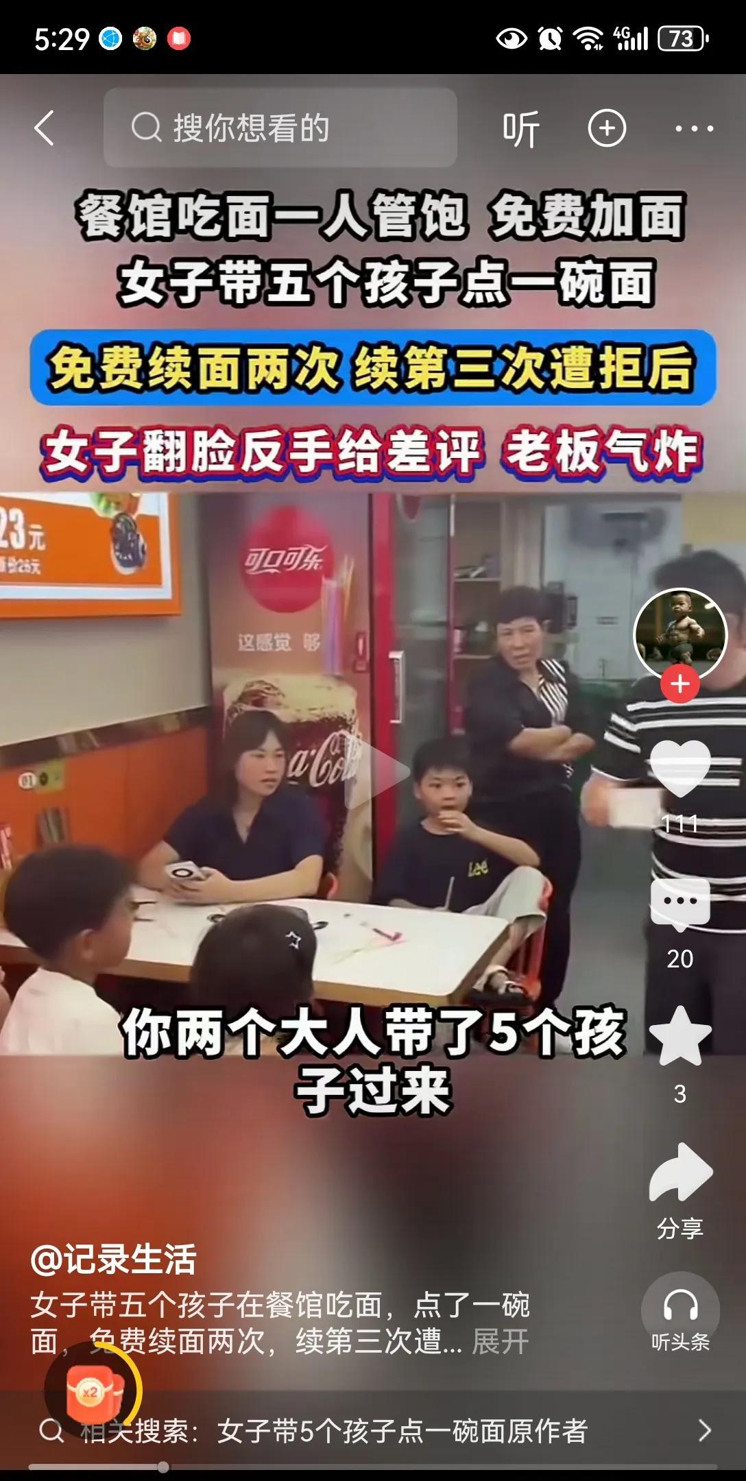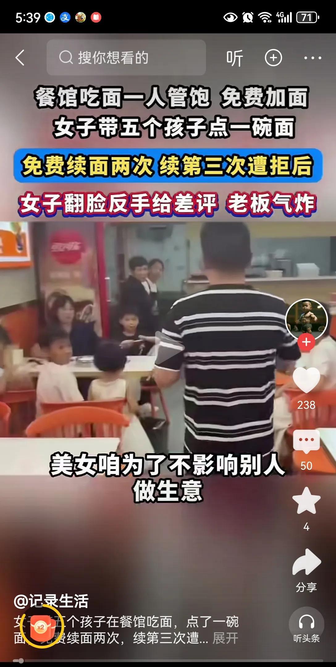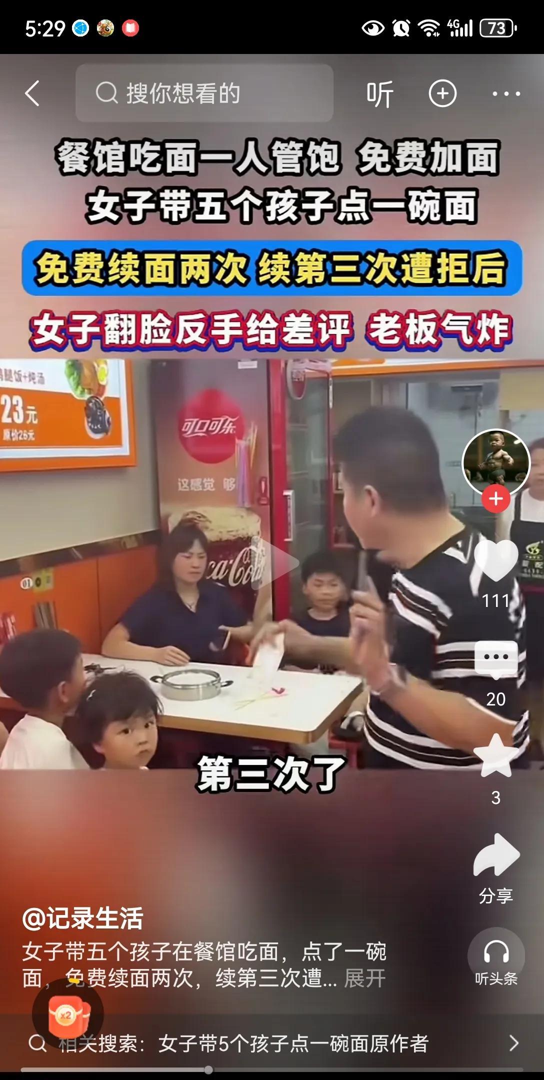 开面馆的小老板,大中午的,突然迎来了一单“大生意”,俩女人带5个小孩,一共7个人,占两桌,竟然就只点一碗面条[捂脸]。 肯定不够吃,所以一直催着老板免费加面。加到第三次,老板拒绝。这女人竟然直接给差评、并且报警! 其实这种情况,不是同行嫉妒生意,就是老板得罪人了,所以,别人故意在大中午的饭点儿,跑来砸场子[不看]。 就像电影里的情节,来两桌人,往大厅门口的桌子一坐,只点一碟花生米,抽烟喝水聊天……你生意还咋做?只不过,人家这个砸场子的,更高明[捂脸]:俩女的带一群小孩儿。 所以,就算是警察来了,能咋样?顶多拍个视频,放网上,自证清白[笑哭]。