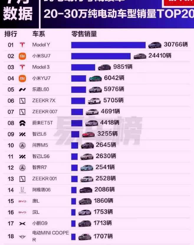 再次强调一下!雷军这回是真的把人得罪完了,公道自在人心!其实当他连夜把吐鲁番YU7的测试结果拿出来的时候,大家都已经明白了。雷军不是好惹的,小米汽车更不是好惹的。扪心自问一辆电车,40度以上的环境下,经过高速,市区,郊区,山区,空调还开到了24度,续航还能达到600km,说句实话这和燃油车真的没有什么区别了吧! 数据可不会说谎!雷军敢把这个排名发出来,就不怕对比。其次就是7月份汽车销量排名也是有目共睹的,虽然小米YU7发布了。但是小米SU7的销量依然做到了20到30万级别的第二名,当然第一名是特斯拉Model Y销量是30766台,而小米SU7则是24410台。 关键接着往下第三名是Model 3是9851辆,第四名就是小米YU7的6042辆车。这已经不是超越和碾压了,而是直接把打的满地找牙了!其实说句实话,雷军已经给传统车企留有面子了。因为小米汽车没有发布之前,恐怕没有传统车企,比如吉利,长城,等等车企想过会是这样的结果吧!距离小米汽车发布也仅过去了1年多的时间 但是很显然,在20到30万级别!小米汽车在新能源市场已经做到了扛把子,当然即便是加上燃油车和合资车型,有几个能超过的。其实现在的新能源的市场,已经从最原来的省电,成本低转化为了产品定义和智能辅助驾驶!产品定义决定了营销口径啊!并不是小米营销多么厉害,雷军影响力多么大。而是他能找到好的切入点去做产品,其次是智能辅助驾驶,小米有自己的智能驾驶团队没有外包,这已经是行业中的翘楚了。关键是能做到随时优化和补救,加上炫酷的外观和小爱同学的语音助手体验,以及小米十几年在手机端积累的口碑和评价,这才是最真实的!各位怎么看