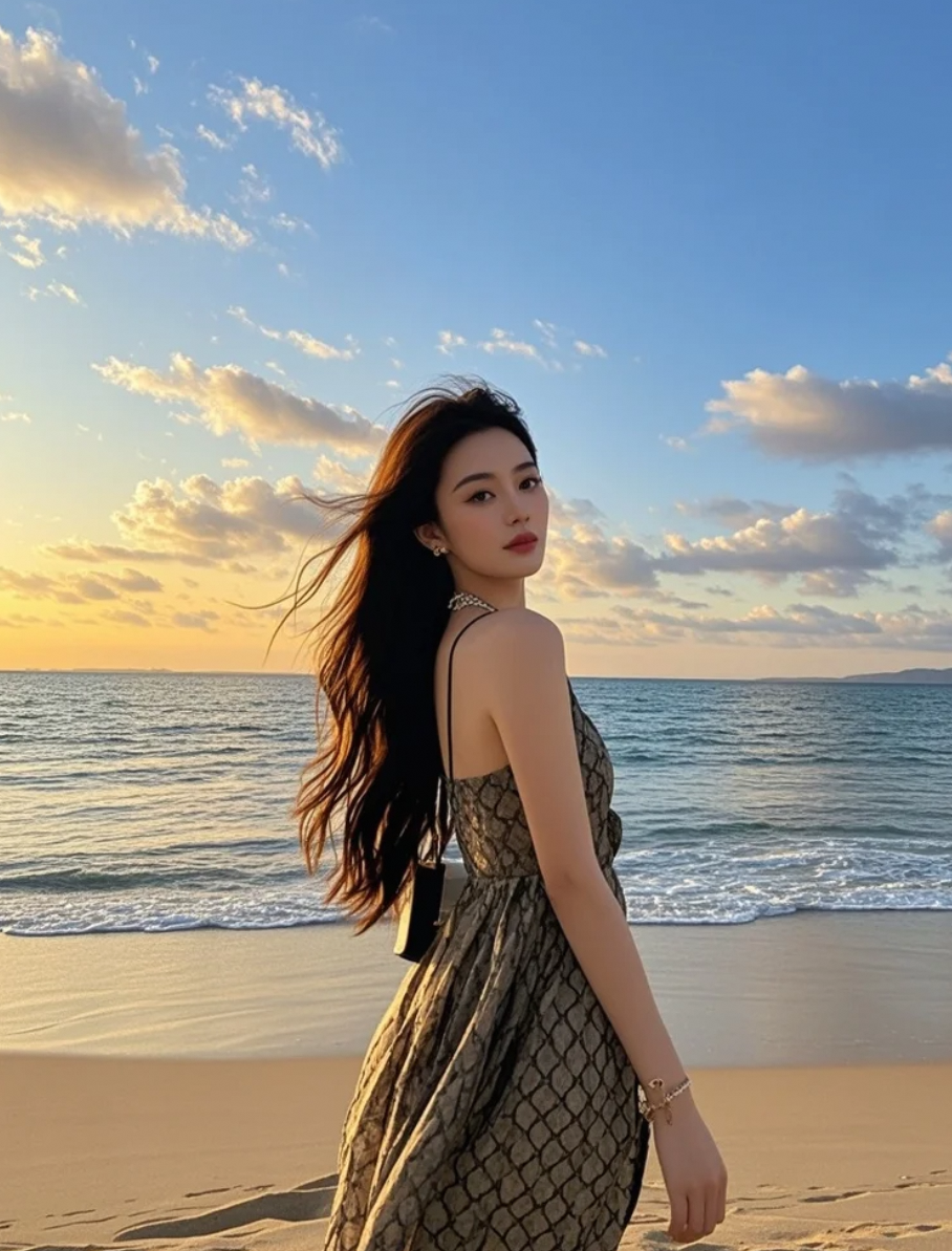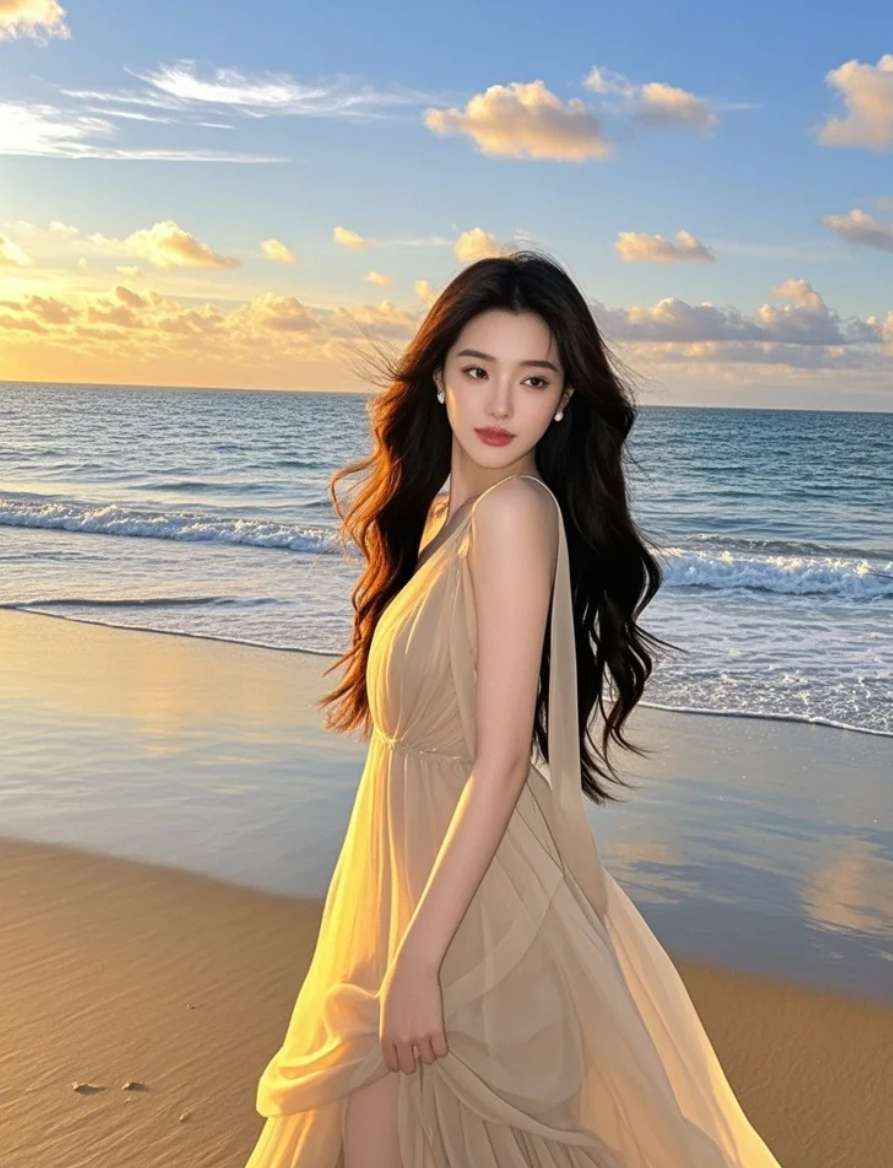 长发美人,踏浪而来,裙角沾满阳光的碎金