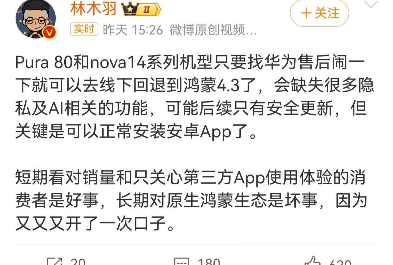 鸿蒙5.0鸿蒙4.3。网上都在传华为Pura80 系列能降级回退鸿蒙4.3了,臣等本欲死战,陛下何故先降?