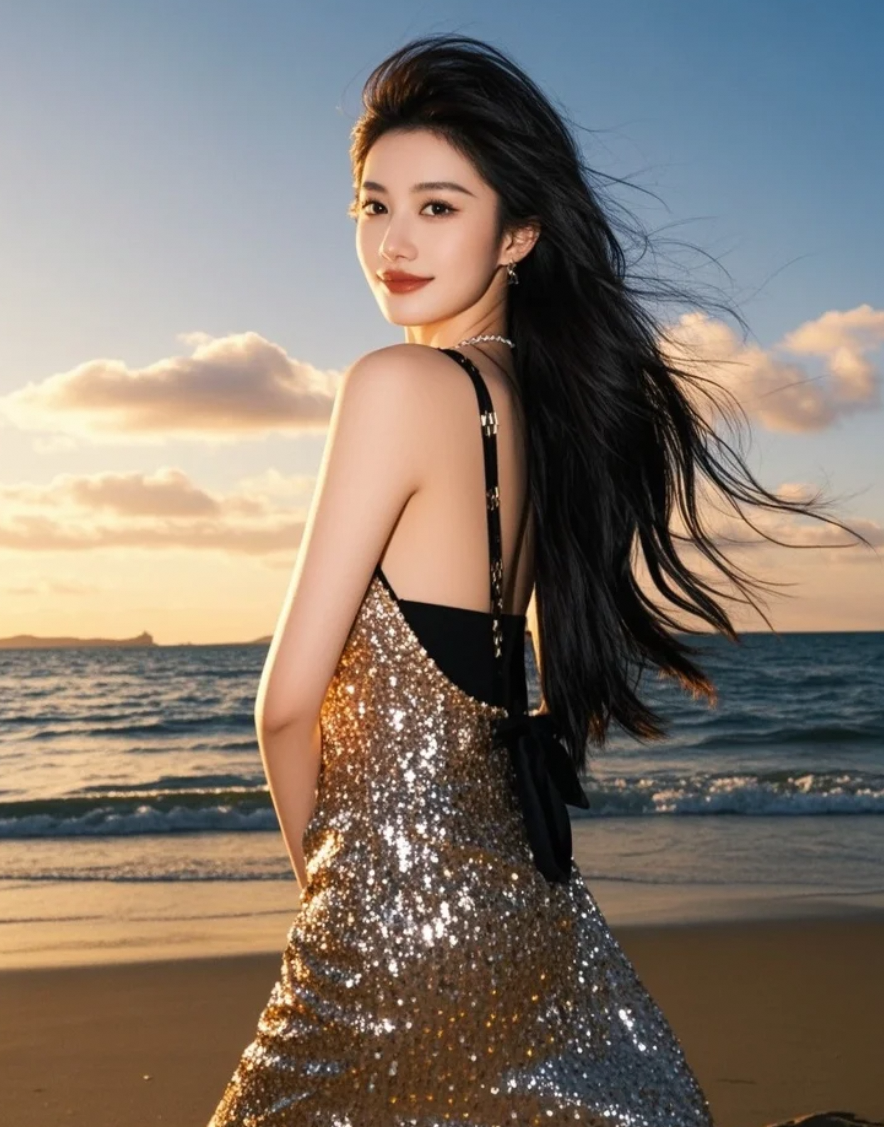长发美人,踏浪而来,裙角沾满阳光的碎金