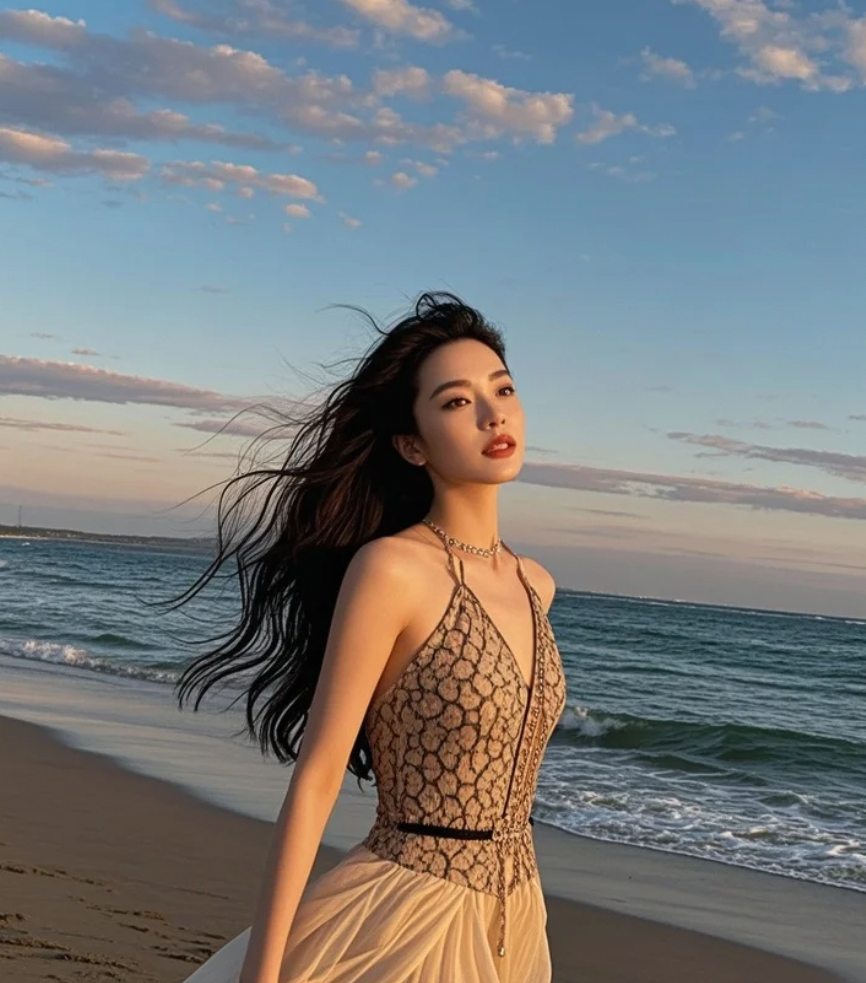 长发美人,踏浪而来,裙角沾满阳光的碎金