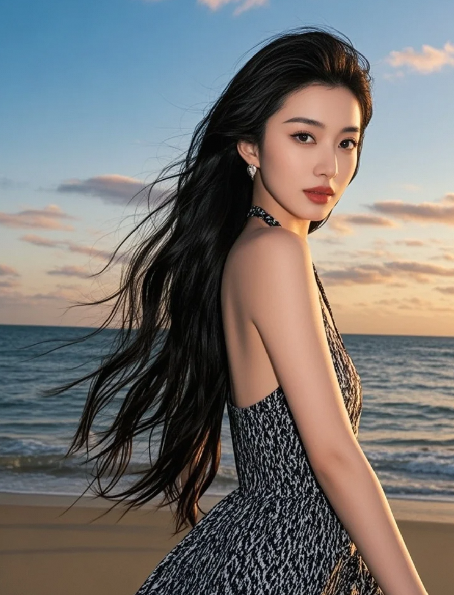 长发美人,踏浪而来,裙角沾满阳光的碎金