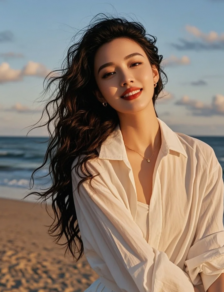发丝飞扬,明艳双唇含笑,她是海边最生动的诗篇