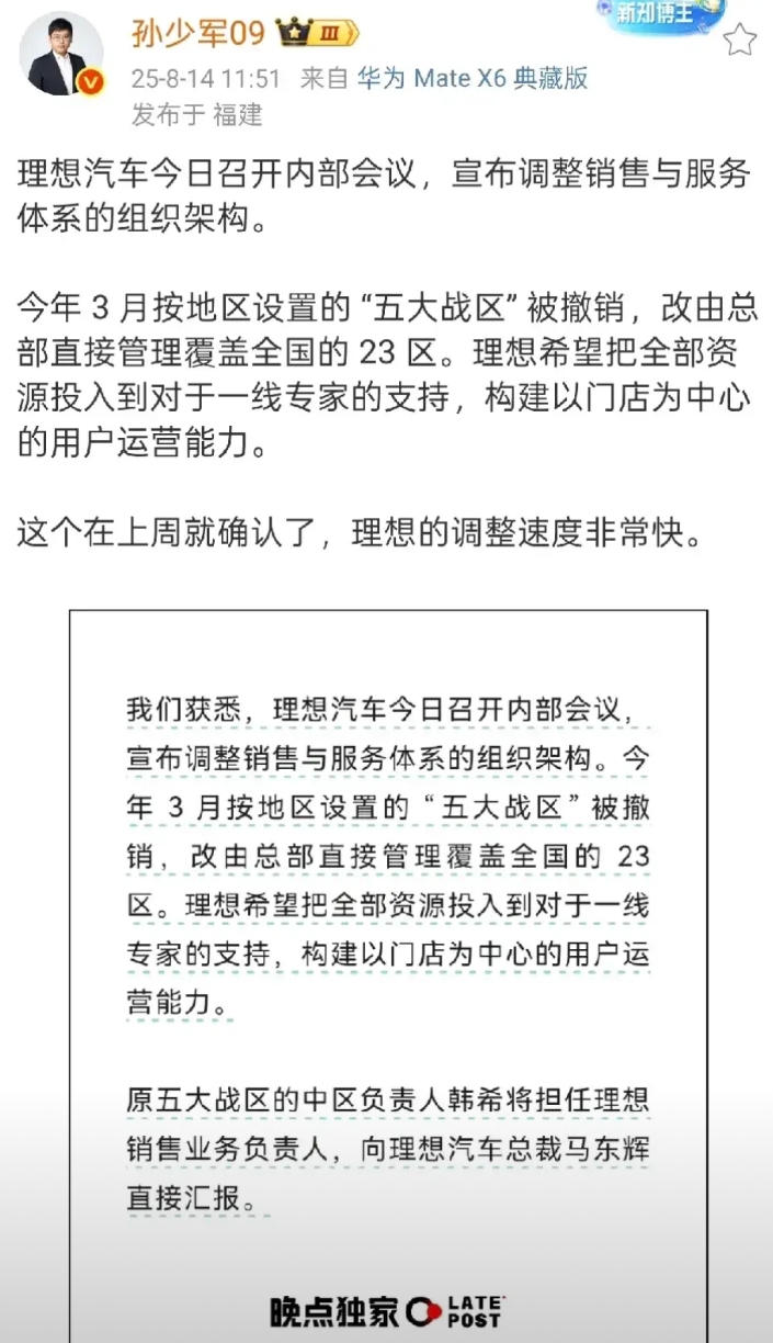 孙少军称:理想打算调整销售服务体系,而且调整动作非常迅速。