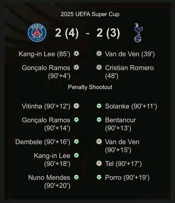 这本该是一举改变热刺整个俱乐部的气质的比赛。 可惜,特尔的替补登场,彻底毁掉了整队的努力。一个鲁莽的定位球犯规,直接让巴黎完成绝平,然后点球大战还要飞点...... 可惜啊热刺,领先了一整场,结果在第85分钟被扳回一城,第90+4分钟被绝平,距离夺冠、距离改变球队历史,仅差几秒了。 如果那个韩国人还在,结局会不会有所不同? 如果巴黎没有这个韩国人的进球,或许结局也会大为不同。 最终,巴黎让二追二,在常规时间双方战成2比2平手,没有加时赛,直接进入点球大战,然后巴黎险胜热刺。 努诺·门德斯进球! 巴黎又一次将英超球队斩于马下。 上赛季欧冠的曼城、利物浦、维拉、阿森纳,再加上此次欧超杯的热刺。看来,巴黎只怕世俱杯的切尔西啊.