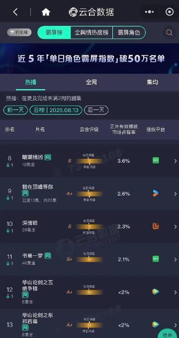 8.13 云合 锦月如歌17.9%, 利剑玫瑰17.8% ,凡人修仙传14.2%,生万物4%,这个老玫瑰太能苟了生万物作为19:30才更新的,还行了