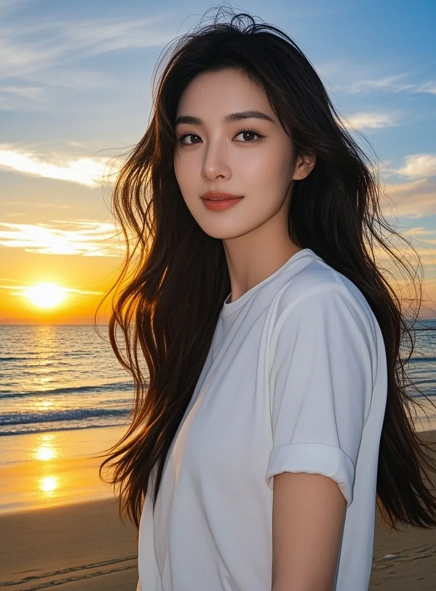 夕阳为她镀上金边,海风为她撩发