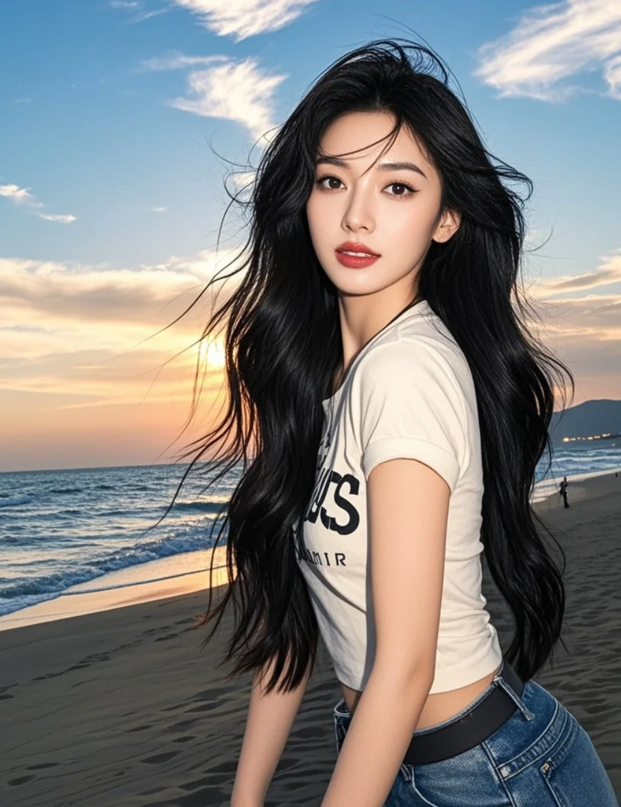 夕阳熔金,长发在海风中起舞,她漫步沙滩,每一步都踏出大牌明星的从容气场