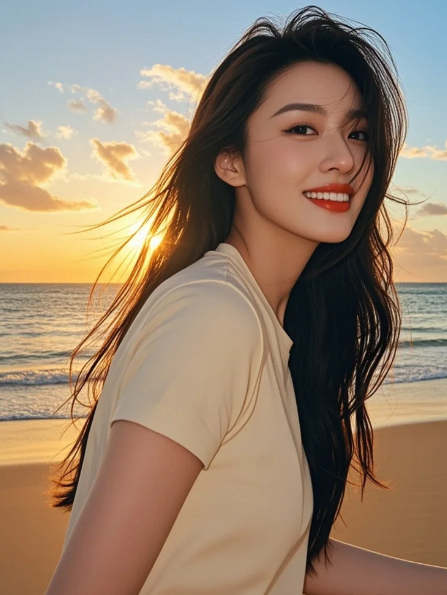 夕阳为她勾勒出金色轮廓,海风为她撩起发丝,她静静发光